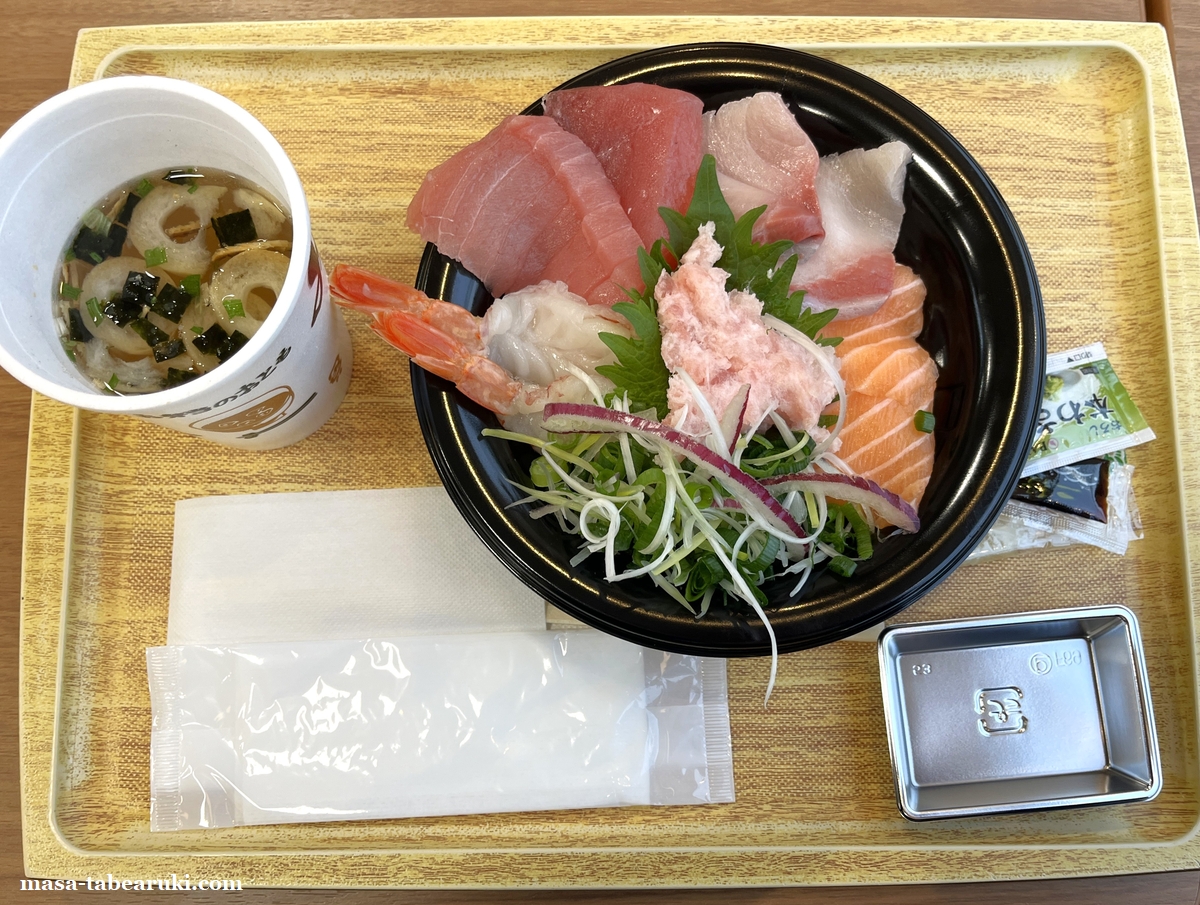 丼の内容は画像の通りでメインの丼の他にインスタントながらお吸い物も付属(自分でポットより熱湯を注ぎます)。わさび、醤油、生姜はポットの場所と同じところに置いてあるのでこれもセルフで好みの量を取ることが出来ます。