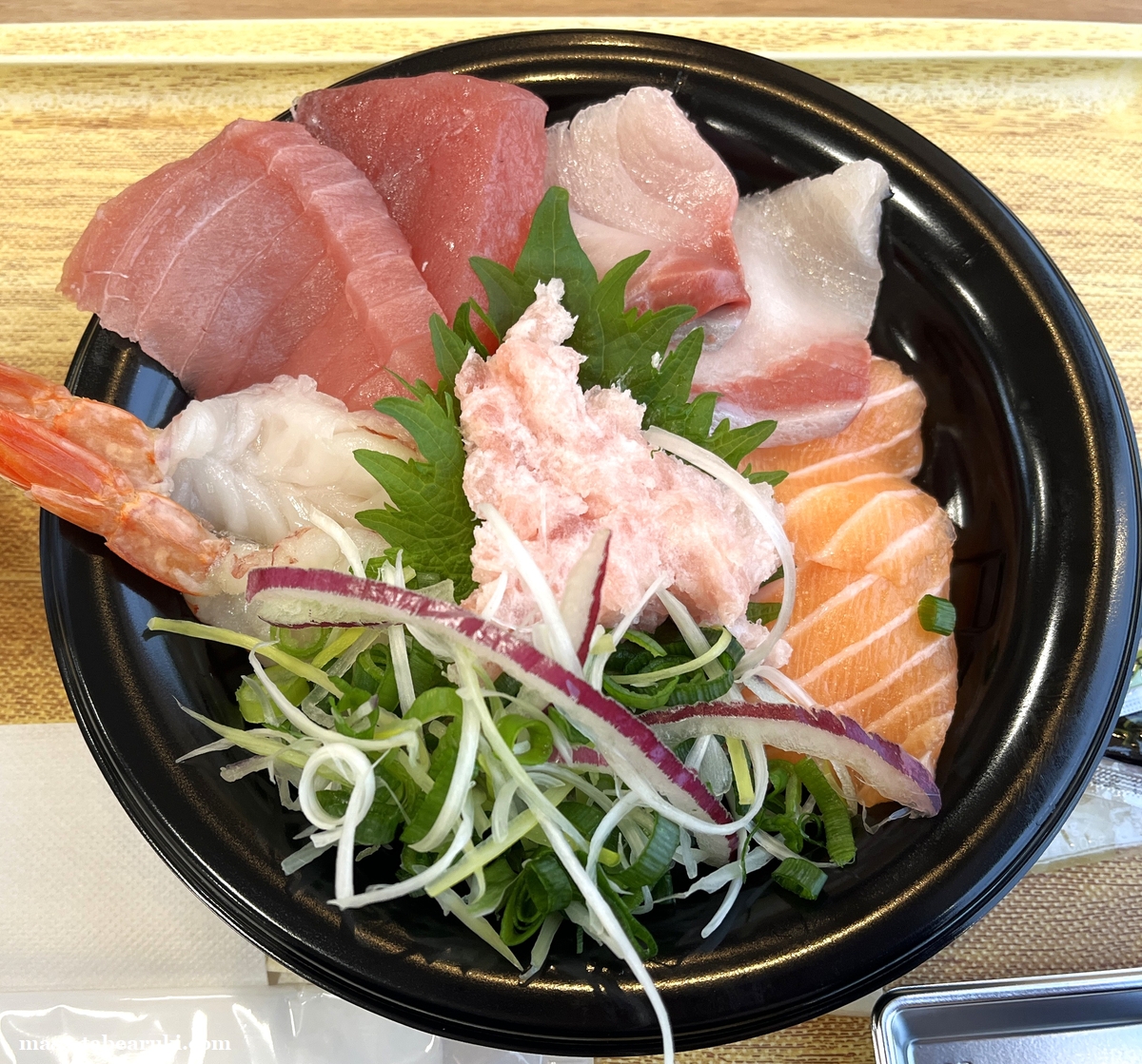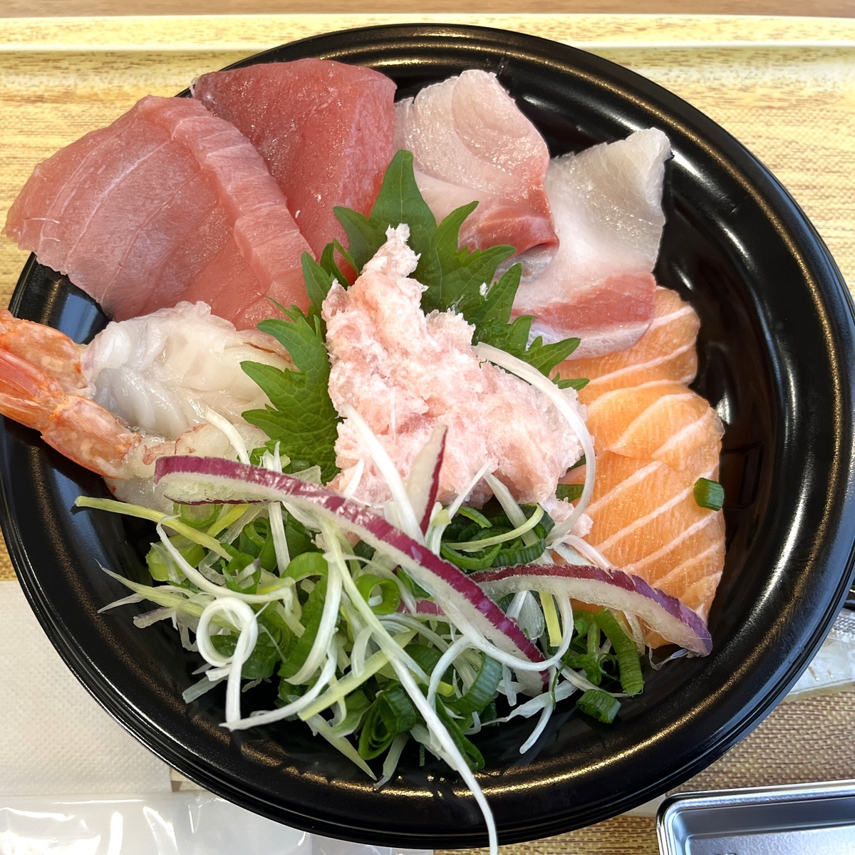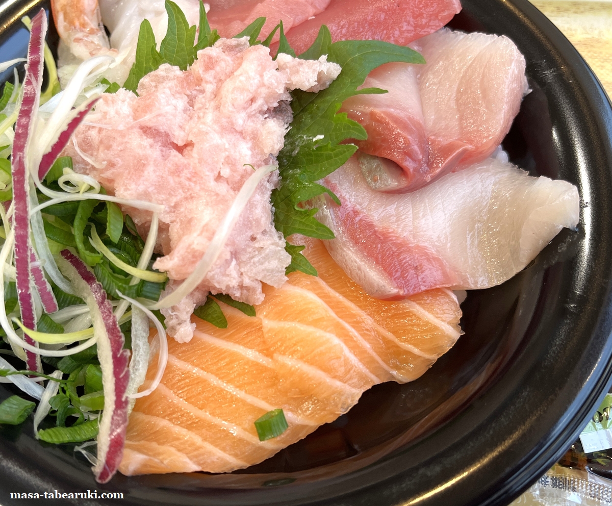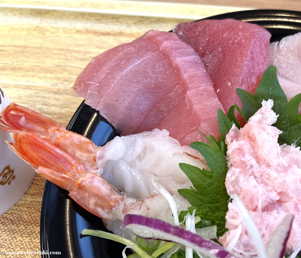 5色丼はまぐろ、ぶり、サーモン、天然物、まぐろたたきが基本となっており、今回の天然物は海老となっていました。注文時には店員さんに海老アレルギーがあるかどうかの確認もされました。