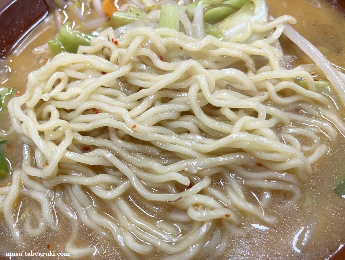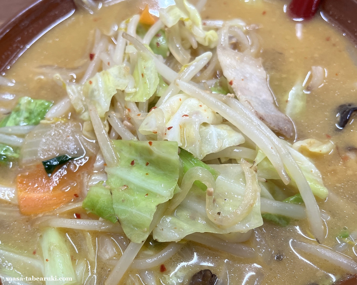 チャーシューはありませんが、味噌も塩ラーメンと同じく多めの野菜が載った状態。野菜は炒めてあるため香ばしさもあり、キャベツ、モヤシ、豚肉、木耳、人参、タマネギなどボリューム感もなかなかあります。