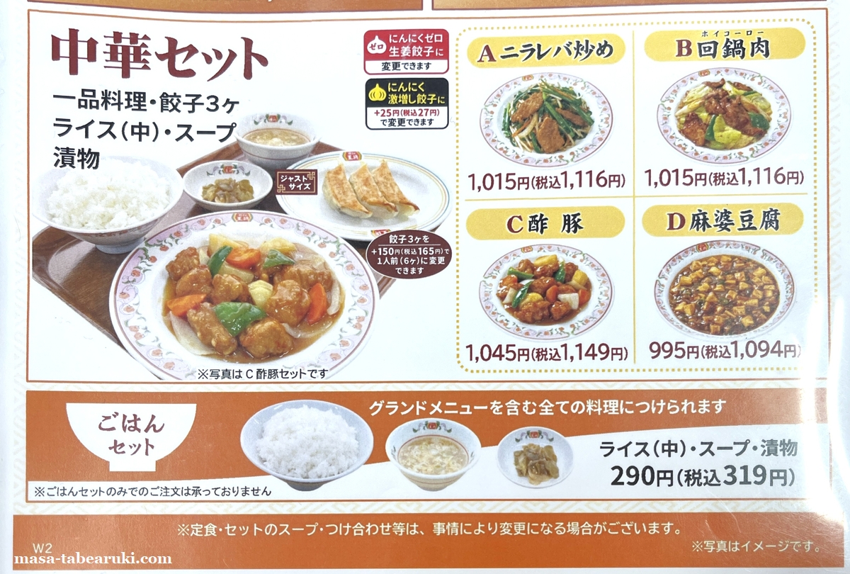 こうして改めて一覧にしてみると仕方が無いとは言え、随分と高くなったなあというのが正直なところ。餃子定食も現在では税込990円ですが、昔は700円台で食べられた記憶もあるのですが。。他のセットも軒並み1,200円を超えているものがほとんど。