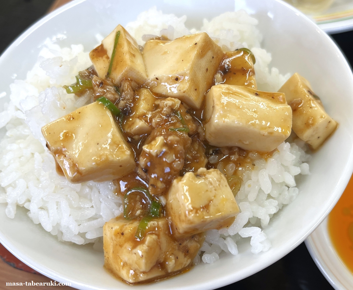セットの内容は前述した通りにメインの麻婆豆腐と餃子3個、ライス、スープ、漬物が付属。メインの麻婆豆腐は大きめの深さもある皿に盛られており、それなりに量もあります。