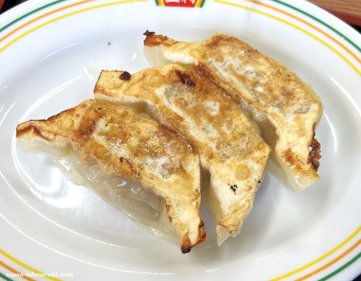 餃子はいつも通りながら3個と半分となっており、いつもよりニンニクの効き具合は優しめ。同額でにんにくゼロ餃子や+27円(税込)でにんにく激増し餃子に変更することも可能です。