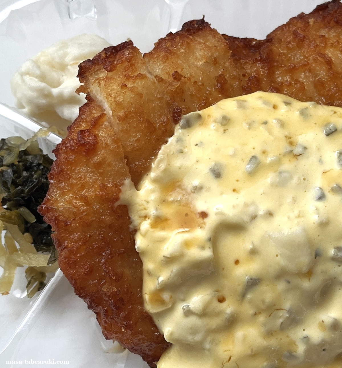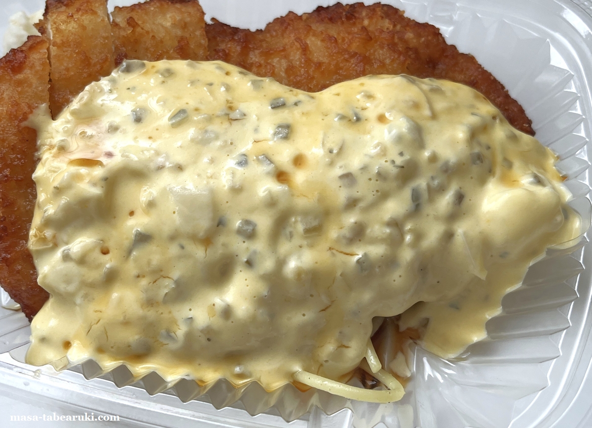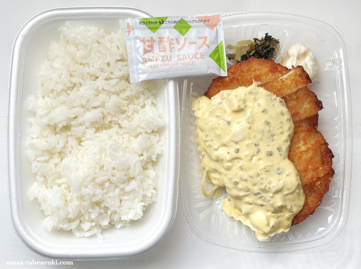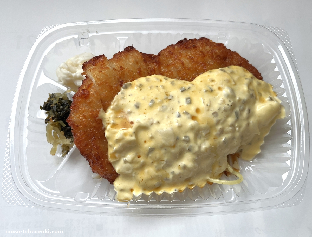 タルタルソースには具材も入っているのでソースとしては食べ応えもあり、甘酢の酸味とタルタルソースの濃厚さでご飯がススム一品。大昔にバイトしていた弁当屋さんにもやはりチキン南蛮弁当があったのですが、これとはまた違ったタイプながら酸味とタルタルソースの組み合わせが好きで良く食べていたのを思い出す(もちろんお金を払ってです(笑))。
