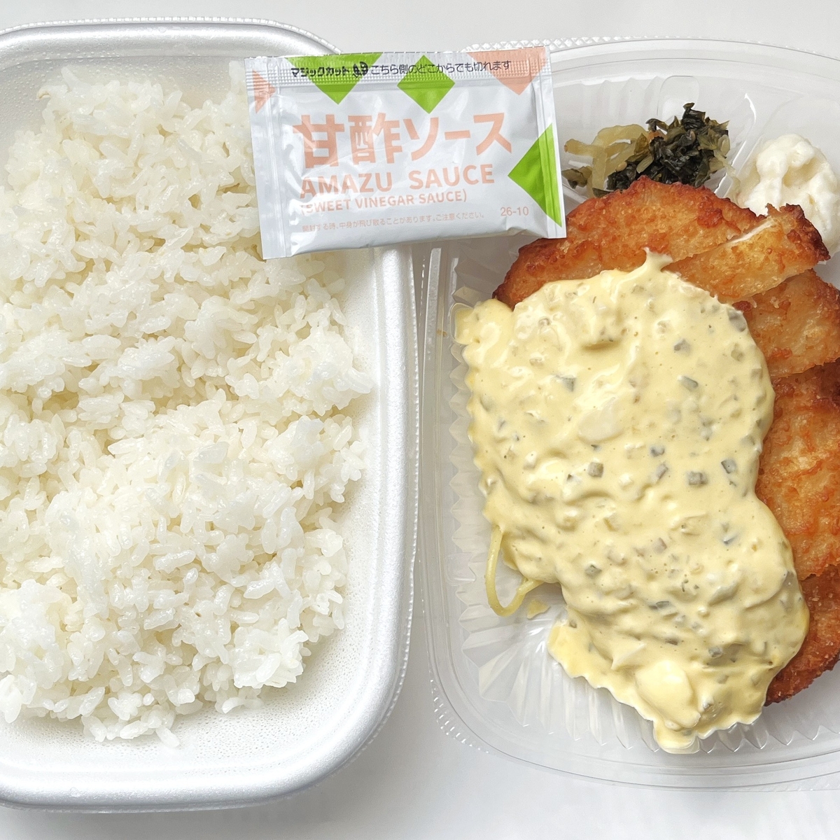以前に食べた九州チキン南蛮弁当はチキン南蛮ソースと甘酢ソースは別添となっており、二つをかけて食べるスタイルでした。しかし通常のチキン南蛮弁当はタルタルソースが既にかけられている状態で、甘酢ソースが別添されているのでこれをかけて頂きます。