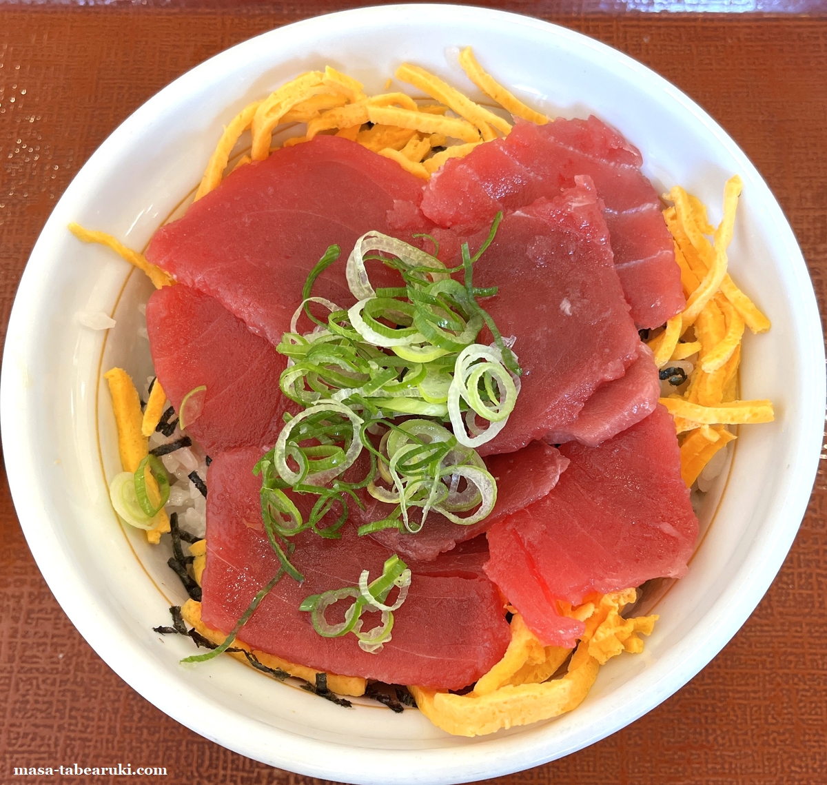 ご飯の上には刻み海苔と錦糸卵が載せられ、その上に本まぐろとさらにネギという形。なか卯の商品では良く見かける錦糸卵は”こだわり卵”を使用されています。