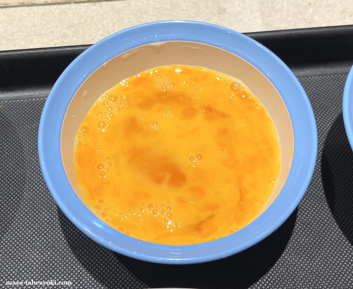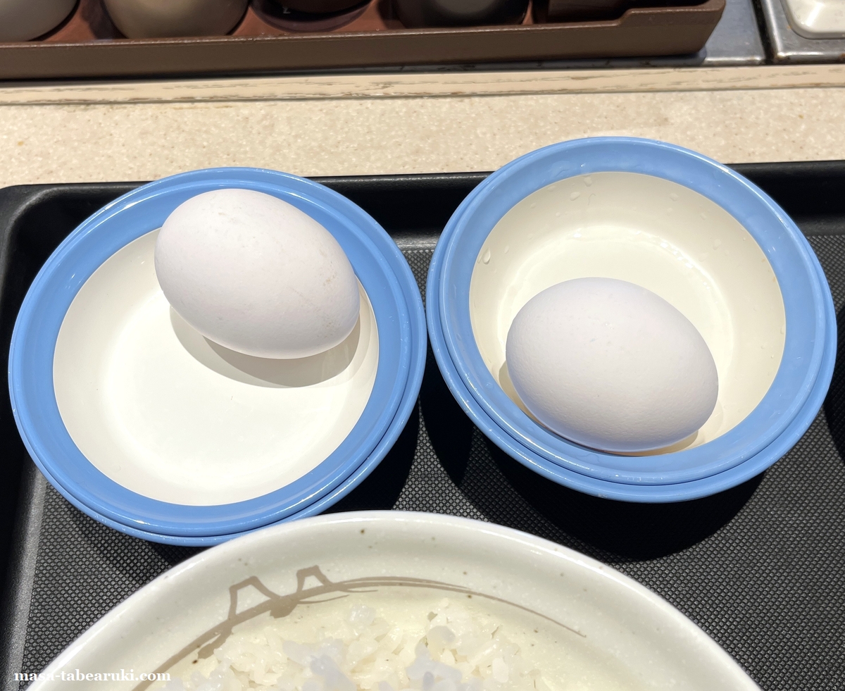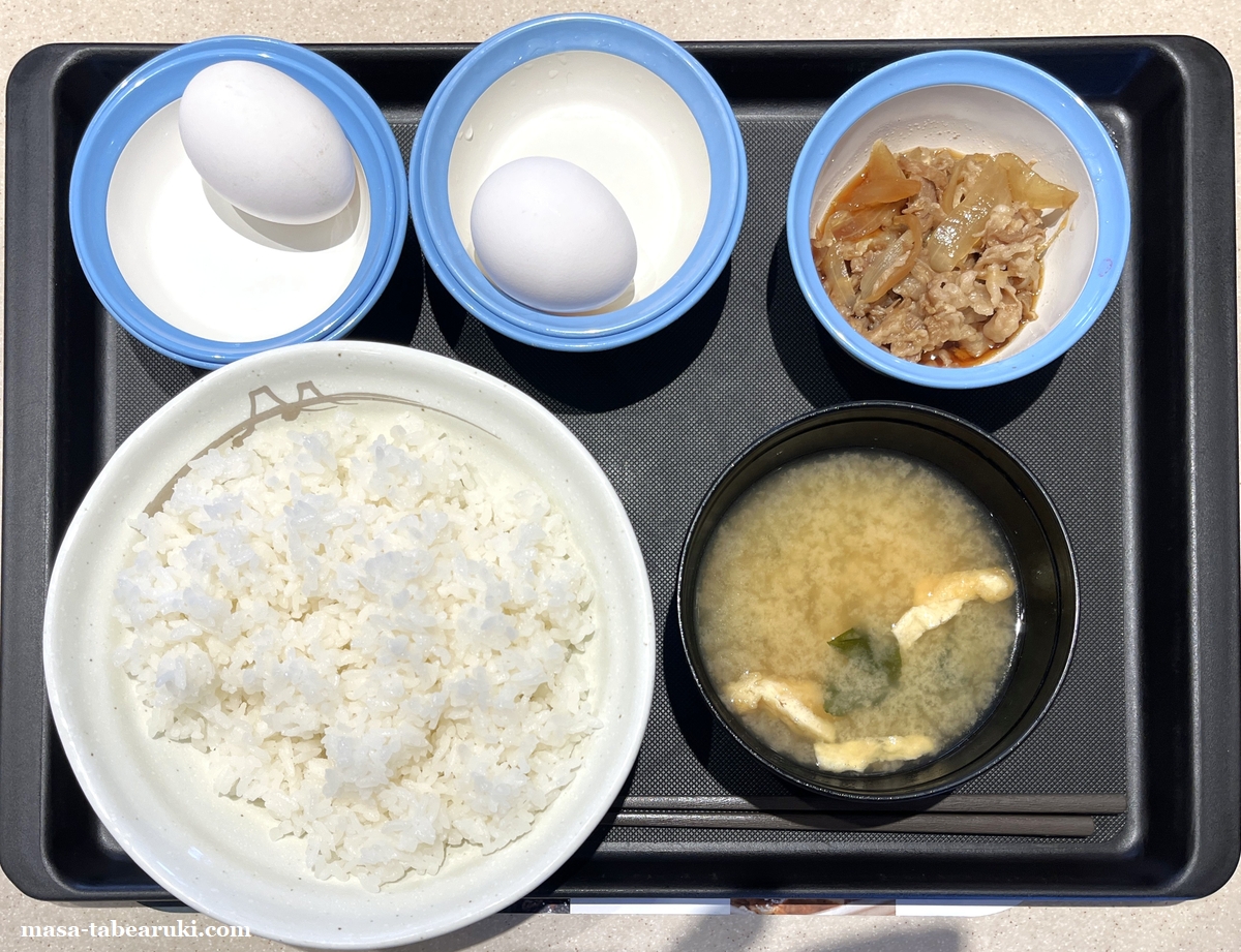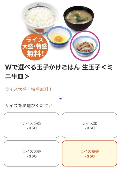 ちょっと話が長くなりましたが、今回朝食として食べたのは「Wで選べる玉子かけごはん」で、玉子は生玉子、選べる小鉢はミニ牛皿を選択し、ご飯は特盛で注文。