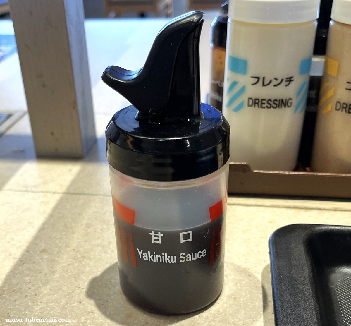 いつもなら卓上の醤油とミニ牛皿のたれを入れて食べるのですが、今回試して見たかったのが同じく卓上にある焼肉用の甘口のタレ。