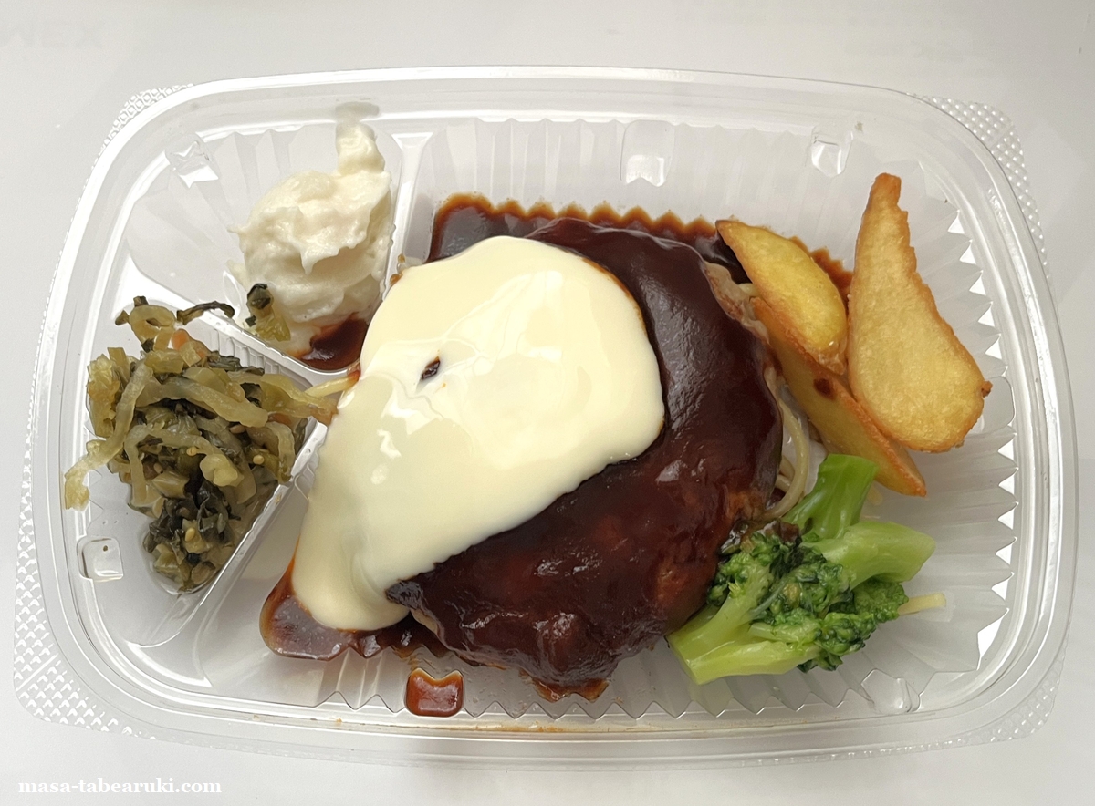 今回はモバイルでの注文では無く、直接お店で注文する形になったので先月食べた「幕の内弁当」の内容が変わっているかな?とカウンターのPOPを見ましたが変更されていない模様。ならば違うものにしようと頼んでみたのは恐らくまだ注文していないハンバーグ系から「チーズハンバーグ弁当」にしてみました。