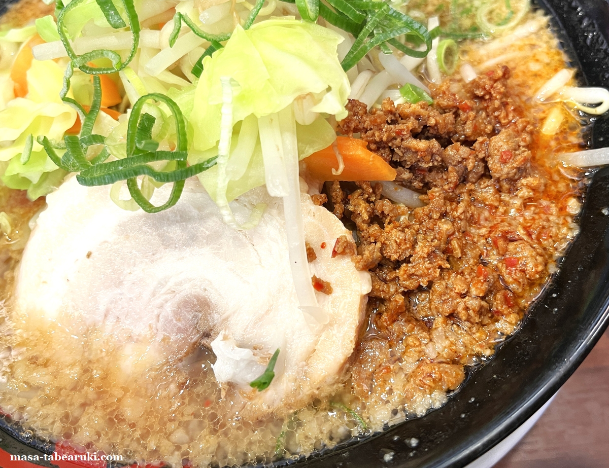昨年と違う部分はチャーシューで昨年は2枚だったチャーシューは1枚になっているところ。しかし価格は昨年と同じなのでこの辺りも高騰の影響のように思えます。チャーシューは厚めのバラ肉でスープの中にしばらく浸しておくと非常に柔らかな食感となり自分好みに変化。ミンチ肉は食べ応えもプラスしており、途中で混ぜるとピリっとした辛味が付加されて良い具合に変化するので自分の良いタイミングで混ぜてしまうのが良いかと。