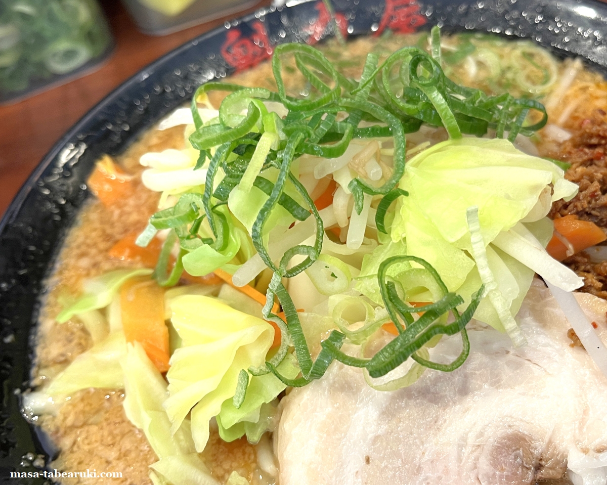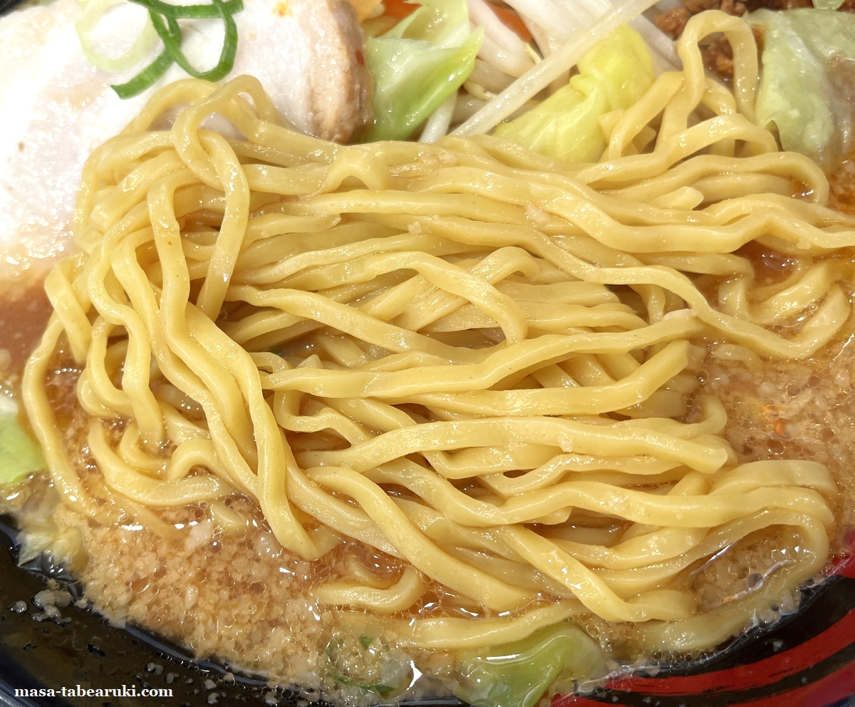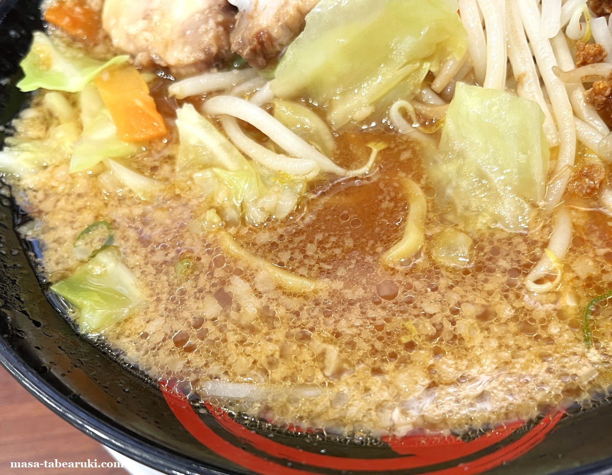麺はこのメニューのために開発したという中太の平たい形状のちぢれ麺で、モチっとした食感があり並盛でもそこそこ量があるように思えます。スープには背脂がタップリと浮いているのは魁力屋らしく、やや濃いめの味噌で風味もしっかりと感じられます。
