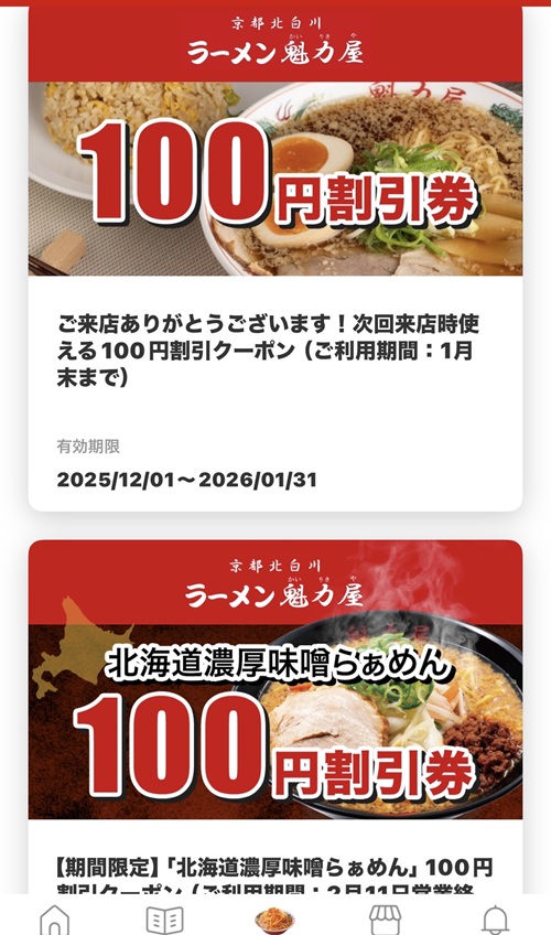 アプリで今回のメニューの100円引きクーポンがあったので使用しました。次の日にはまた100円引きのクーポンが配布され、会計時には紙の100円引きクーポンが貰えますが、魁力屋ばかりに行かなアカンようになってしまう(笑)