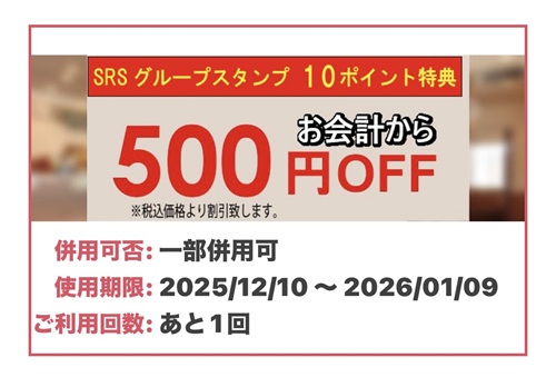 今回使用した500円引きクーポンはアプリのSRSグループスタンプを貯めた(10個)ものによるものですが、得得のアプリスタンプでも10個貯めれば同じく500円引きクーポンが貰えます。SRSグループブランドのアプリではSRSスタンプは共通で貰えるため1回の訪問でスタンプはSRS、得得の両方において1つずつ貰えます(他のブランドも同じ)。