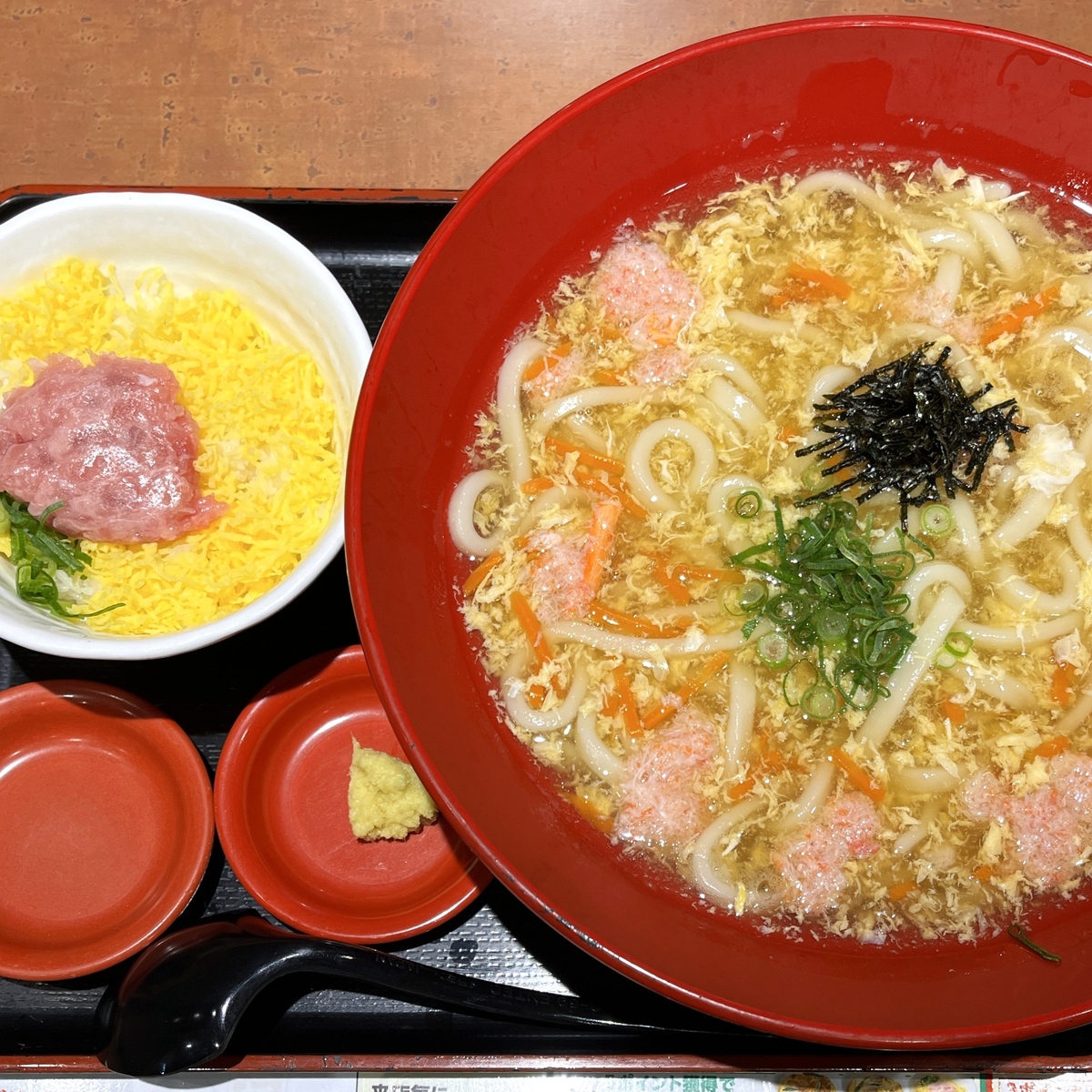 昨年12月に「得とり唐天玉子とじあんかけうどん」を単品で食べましたが、今回は500円引きクーポンもあるのでセットで注文することに。では今回はもうひとつのあんかけ系である「かにの玉子とじあんかけうどん」をセットで頼み、ミニ丼はネギトロ丼にしました。