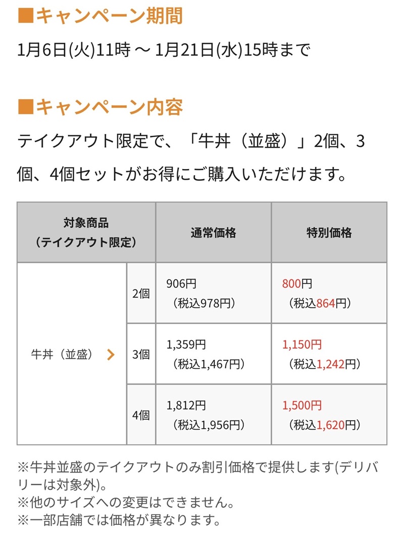 昨年の4月から5月に始めにかけても行われたキャンペーンで、今回は画像の通りに2026年1月6日11時~1月21日15時までの期間で、牛丼(並)が2個、3個、4個がお得に買えるというもの。