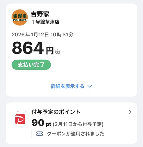 で、早速牛丼を2個注文しますが、価格は通常の978円のままでオーダー完了。あれ?どこかのボタンを押す必要があったのかな?と思いながらも待っていると牛丼が完成して支払い。PayPayで払ってみるとちゃんと割引が適用されて税込864円となっていました。