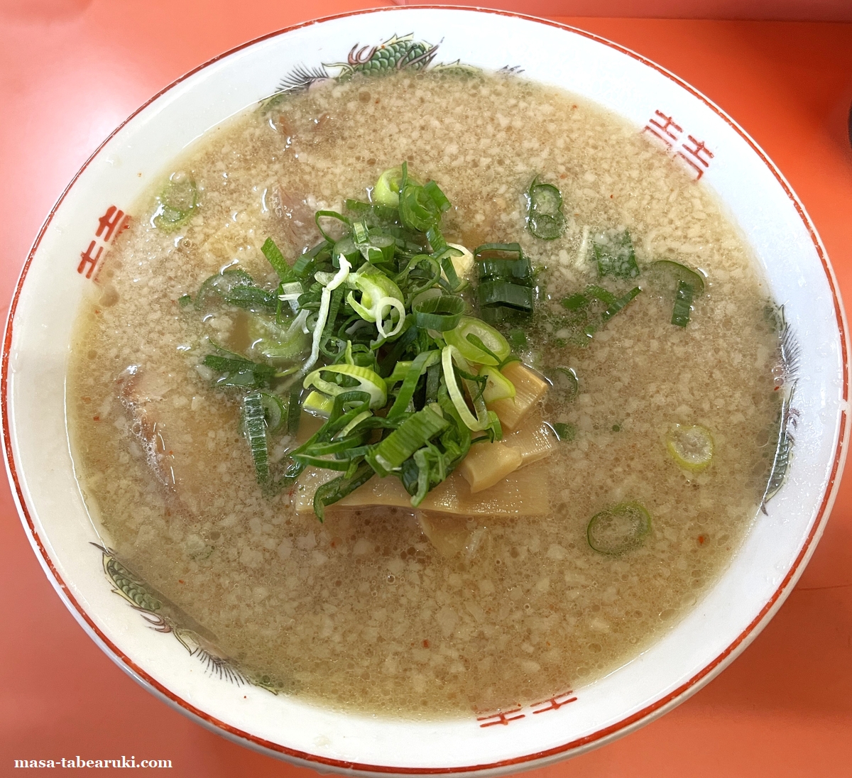 店内に入るとこんな時間帯でもそこそこ客は入っており、さらに券売機があることに気付きました。以前は無かったと記憶しているのですが、3年も来ていないと色々変わるものですね。では券売機の画像は撮り忘れてしまいましたが、メニューは以前と変わっていない印象だったので今回は基本に戻って「ラーメン(並)」で注文。待つこと数分で到着しました。
