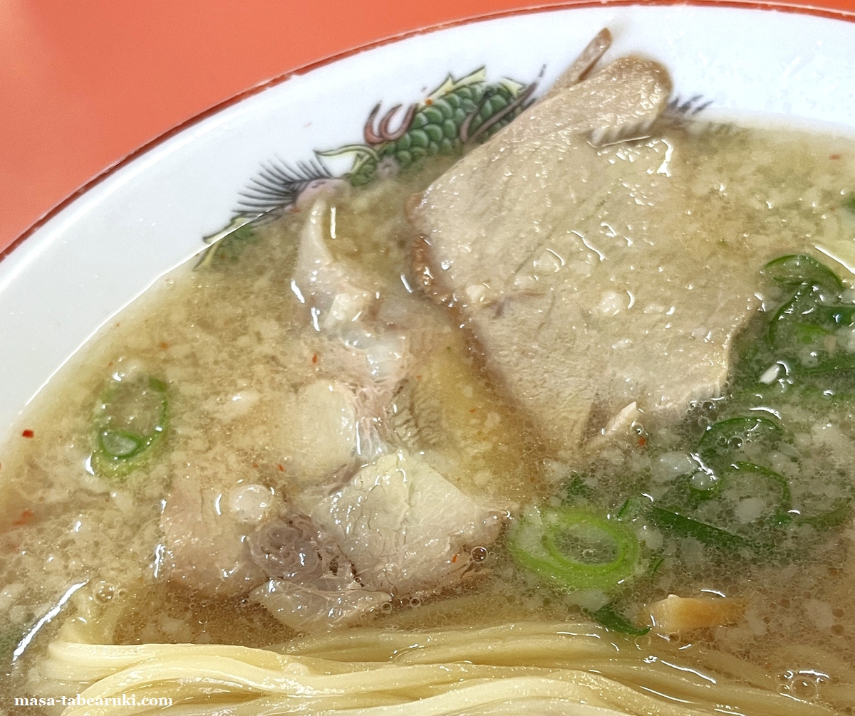 具材はチャーシュー、ネギ、メンマと定番。メンマはそれほど印象に残らないものの、ネギは風味が良くラーメンとも良く馴染んでいます。
