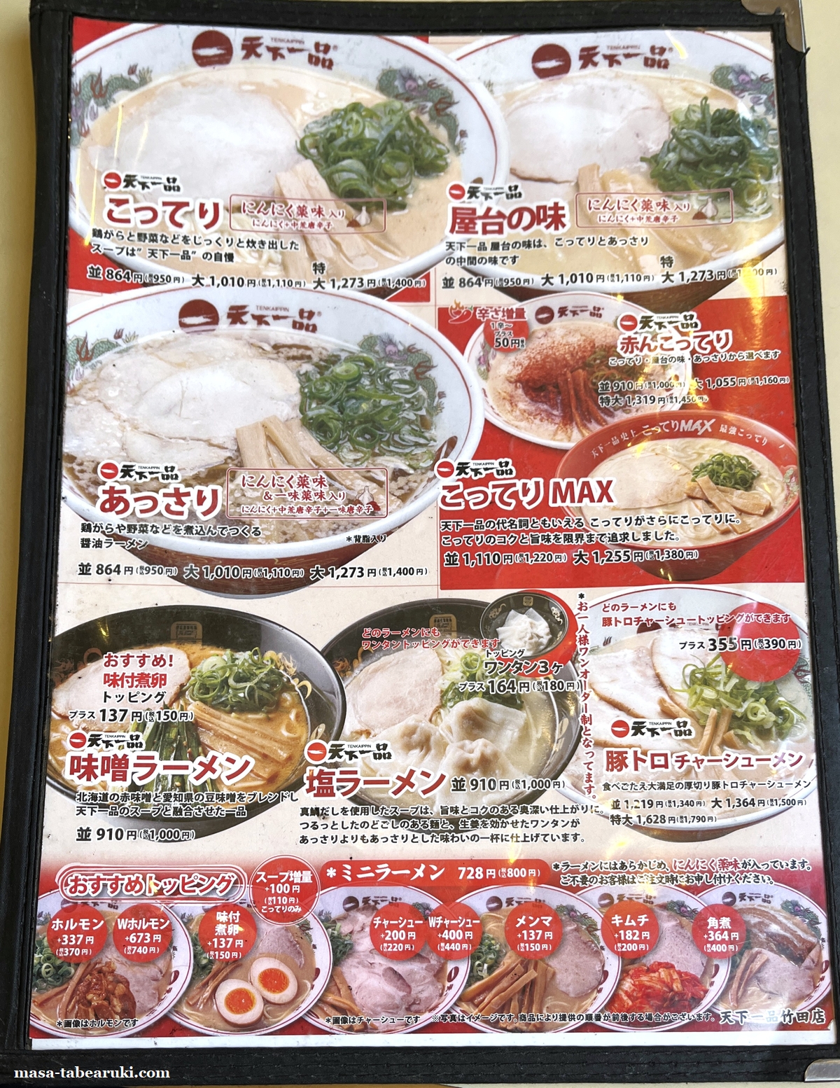 しかし、先日もうひとつあっさりしたラーメンを選択できることに気付いたので、それを食べるために入店して着席。まずはメニューを確認します。