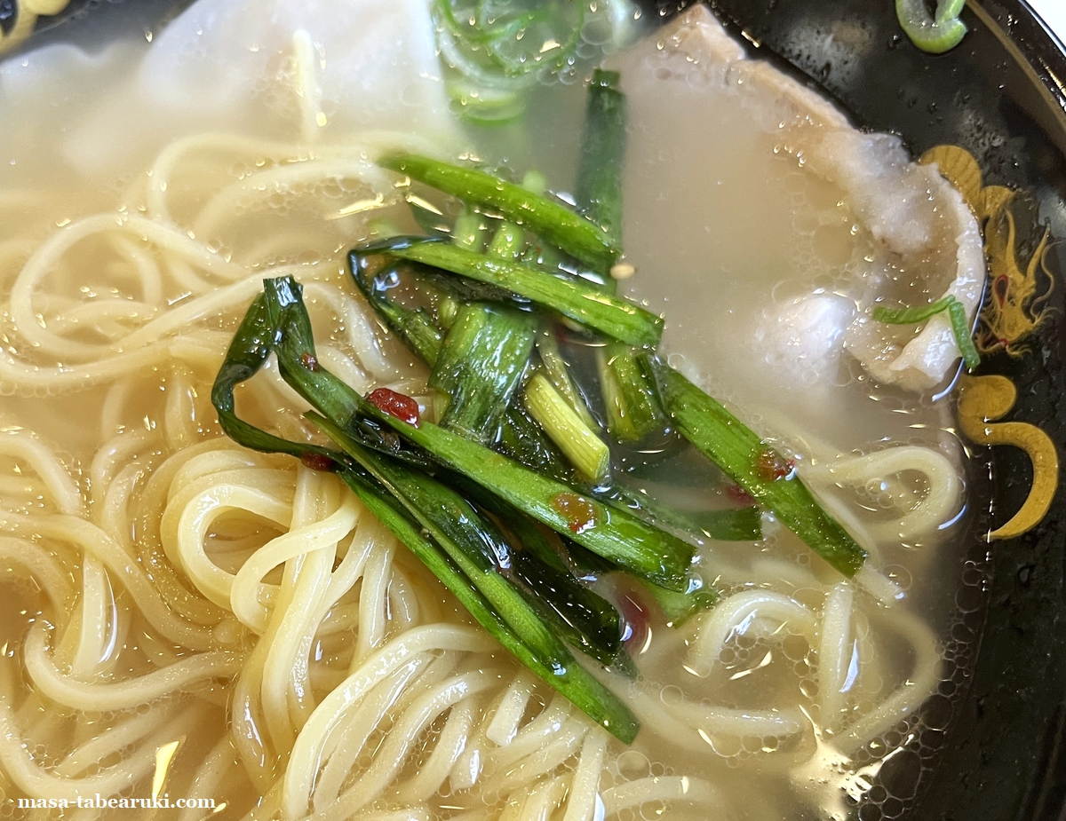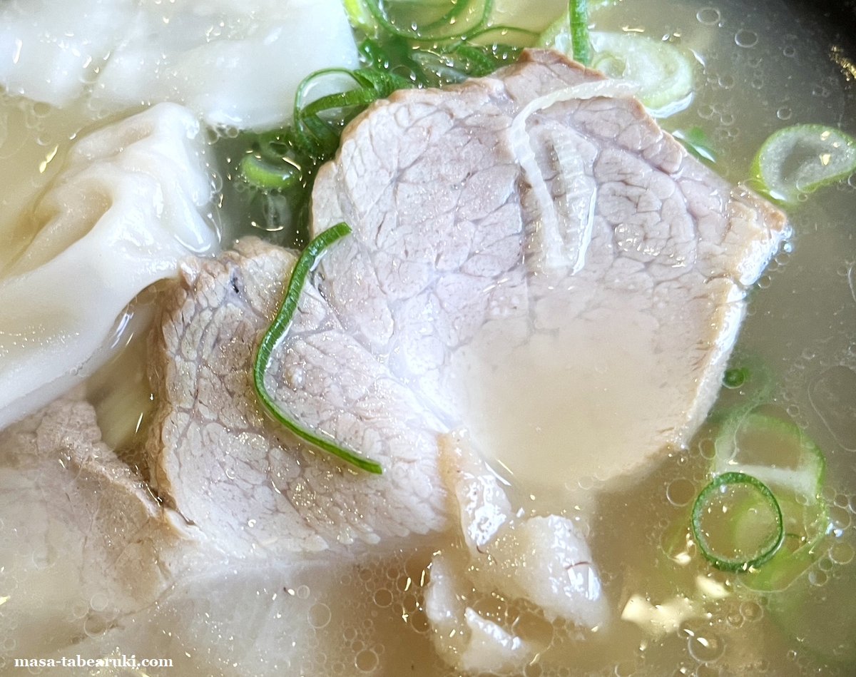 具材はチャーシュー、ネギ、ワンタンとなっており、見た目はいかにも”塩”という感じで、「あっさり」よりもあっさりしていそうな印象を受けます。