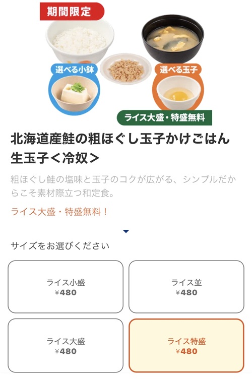 モバイルオーダーの画面には”期間限定”の文字があり、いつまでなのかは不明ですがいつもの玉子かけご飯に変化を付けるならこれにしてみるのも良いかもしれません。なお、これは朝食メニューなので販売時間は午前5時~午前11時となっています(単品北海道産鮭の粗ほぐしは終日販売)のでご注意下さい。