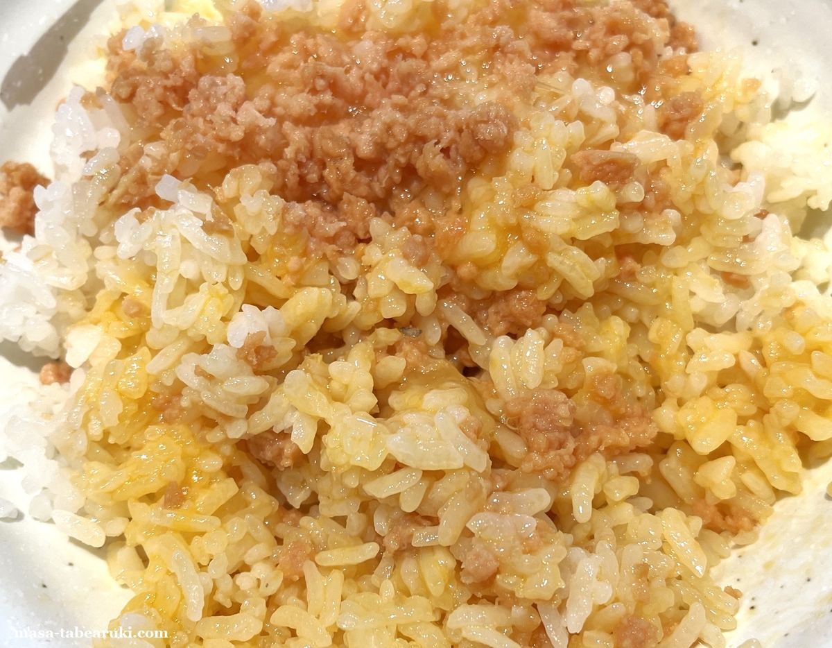 玉子かけご飯に鮭を全部のせて完成。鮭はいわゆる鮭フレークのようなもので、昔は良く白飯に載せて食べていた時もありました。玉子かけご飯に鮭の風味と塩気がプラスされるため、醤油もそれほど多く入れなくても良いかと。