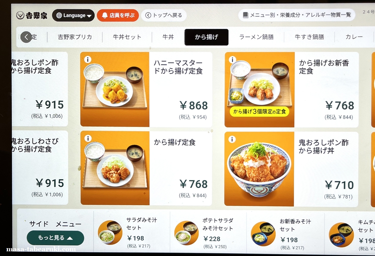 から揚げ1個をお新香に変更はタブレットでどう注文する?吉野家の『から揚げお新香定食』