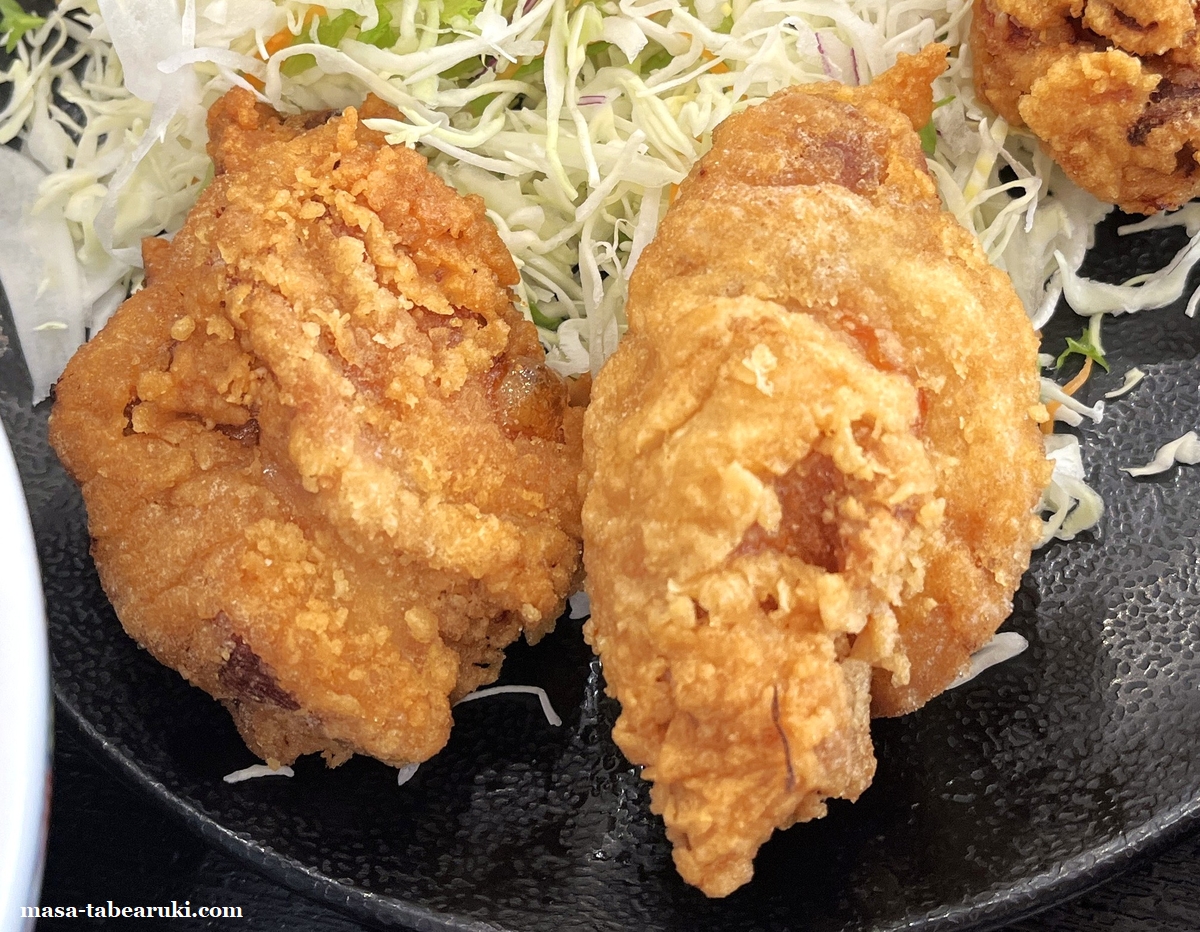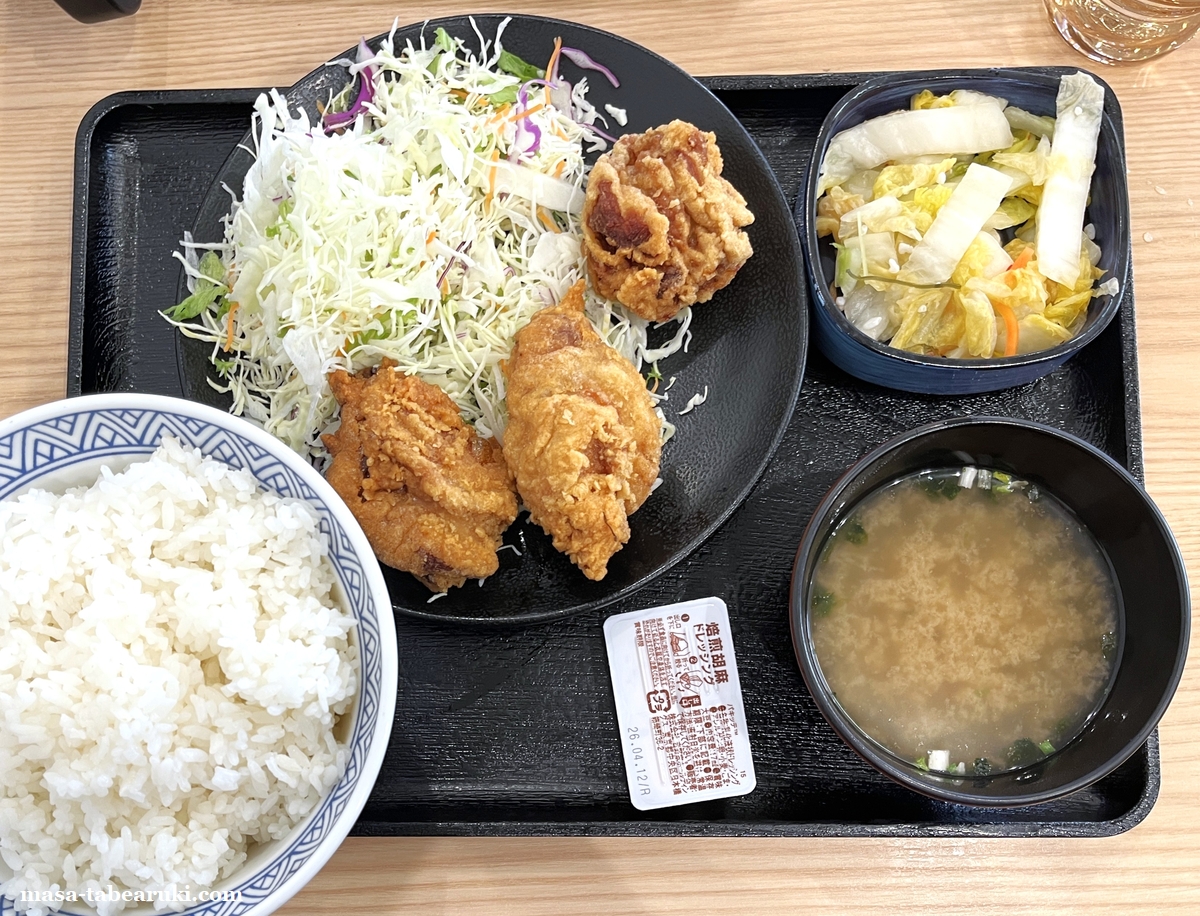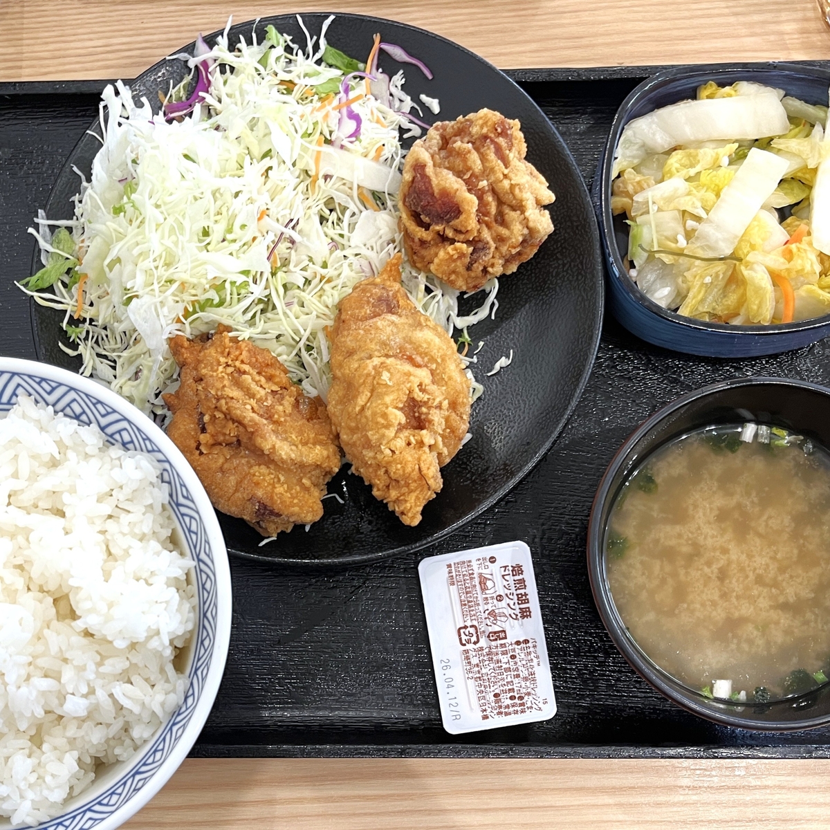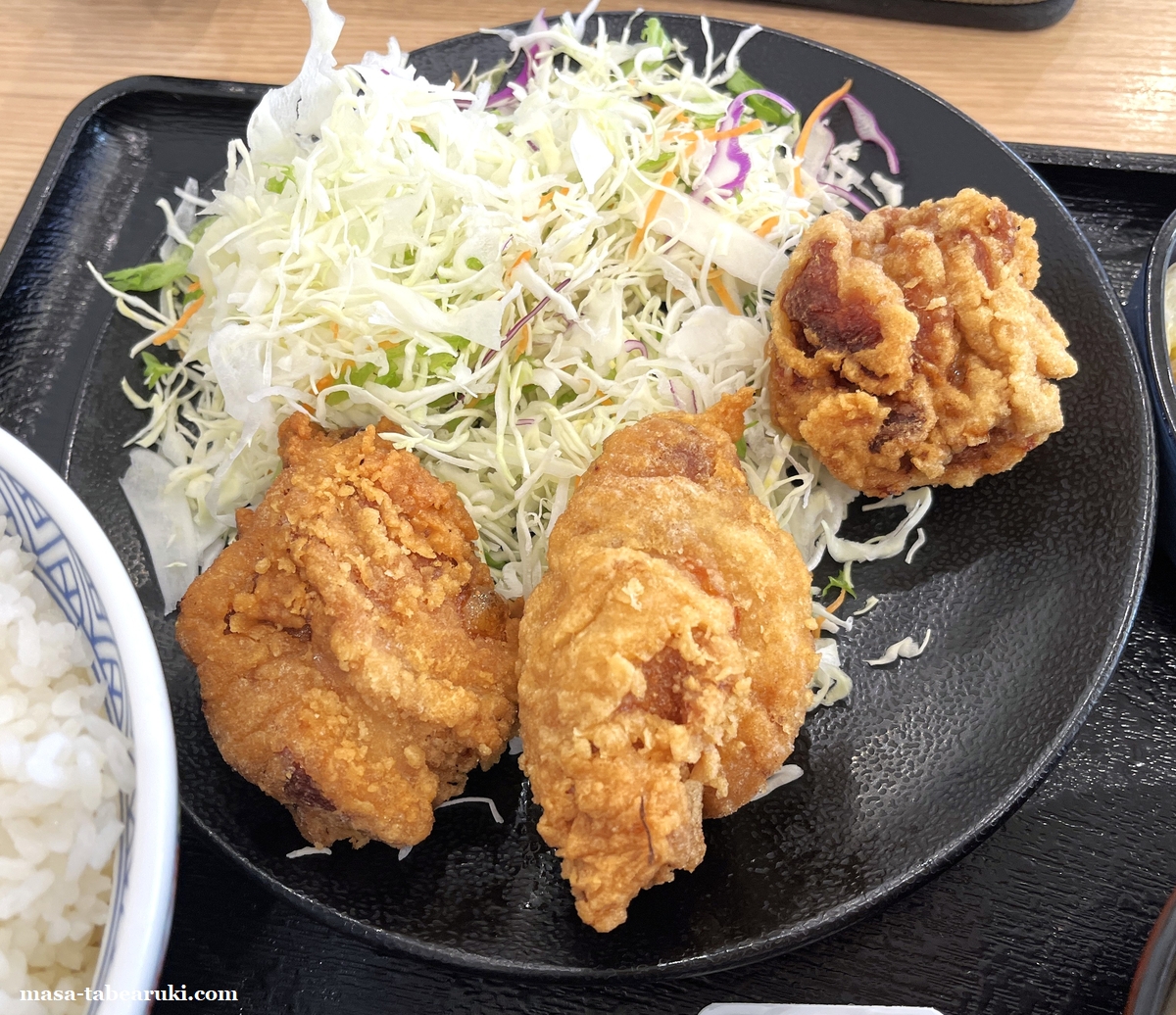 吉野家のから揚げは1個のサイズが大きめで食べ応えもなかなかあるタイプ。コロモはカリカリ食感で中も熱々でジューシーさもあり、何も付けなくてもそのま食べることが出来るくらい下味もしっかり入ってます。