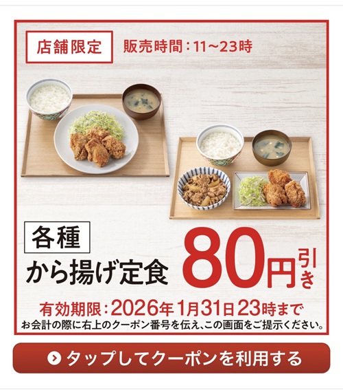 で、今回はこのクーポンもアプリにあるので、から揚げ定食にしようと決め並サイズで注文することに。通常であれば税込844円の定食が764円食べられるのもありがたい。