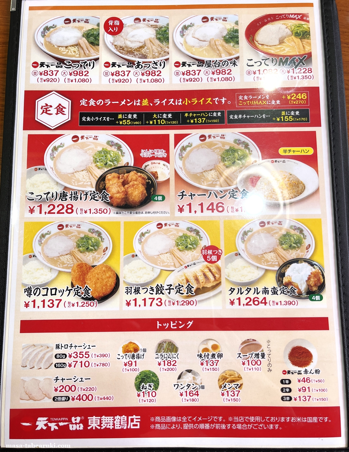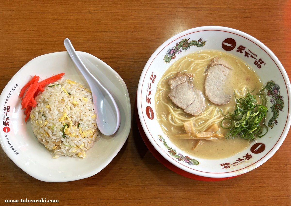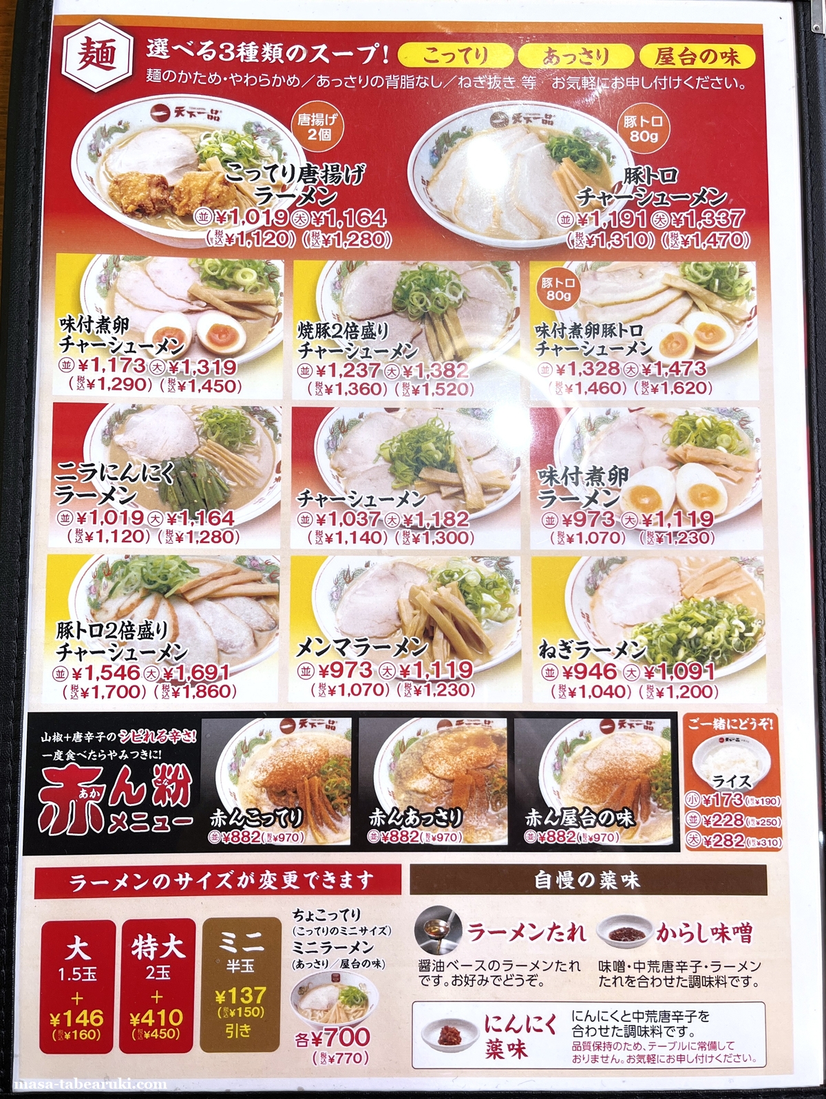 ラーメンはこってり、屋台の味、あっさり、こってりMAXはあるとして、味噌や塩と言ったメニューは記載されていません。麺の量は並と大の価格の記載はありますが、裏面を確認すると大(1.5玉)が税込+160円、特大(2玉)だと税込み+450円となります。ただ特大だとラーメン一杯が1,370円とかなり高くなってしまうので、今回は並サイズで「チャーハン定食」をチョイス。