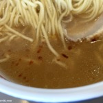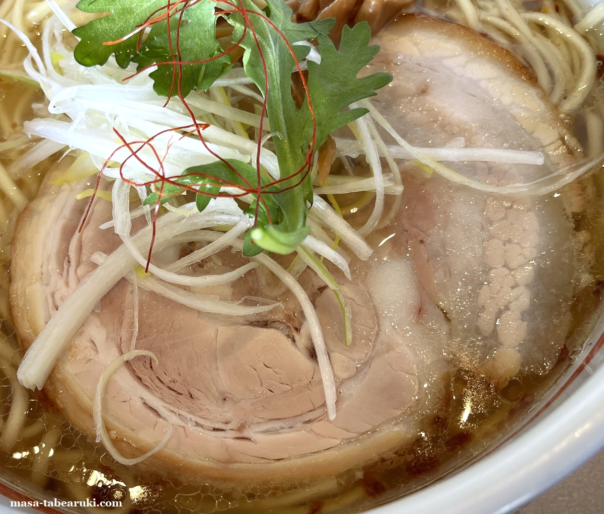 具材はチャーシュー、白ネギ、菊菜、メンマ、焦がしネギ、糸唐辛子と他の店舗とほぼ同じ(菊菜は水菜になっていた時期もある)で、見た目も同じですね。