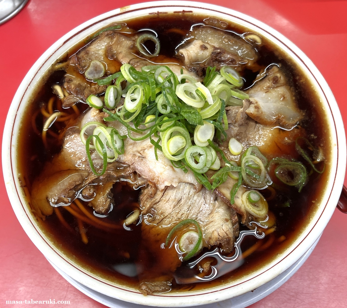 麺は少し太めに感じカタメに茹でられているため、サックリとした歯切れの良さも感じられます。真っ黒なスープは醤油辛さは無く、表面にほとんど油が浮いていないのも特長かと。