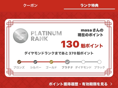 アプリを初めて使用してから10か月ほどになりますが、現在の私のポイントは130魁ポイントのプラチナランクとなっています。ランクは獲得した魁ポイントによって変わり、ブロンズ(0~29)、シルバー(30~59)、ゴールド(60~119)、プラチナ(120~499)、ダイヤモンド(500~999)、ブラック(1000~)6種類のランクに分かれています。
