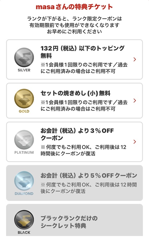 シルバーとゴールドの特典は1回限りで1度使用すると次はありませんが、プラチナやダイヤモンドの特典は12時間すると復活するので何度でも使用可能となっています。ブラックに関してはシークレットとなっているため分かりませんが、ネット上でこれついて投稿されている方の情報だと、10%OFF+ラーメン丼なのだとか。さらに特典はこのラーメン100円引き券との併用もOK(今回も実際に使用しました)。
