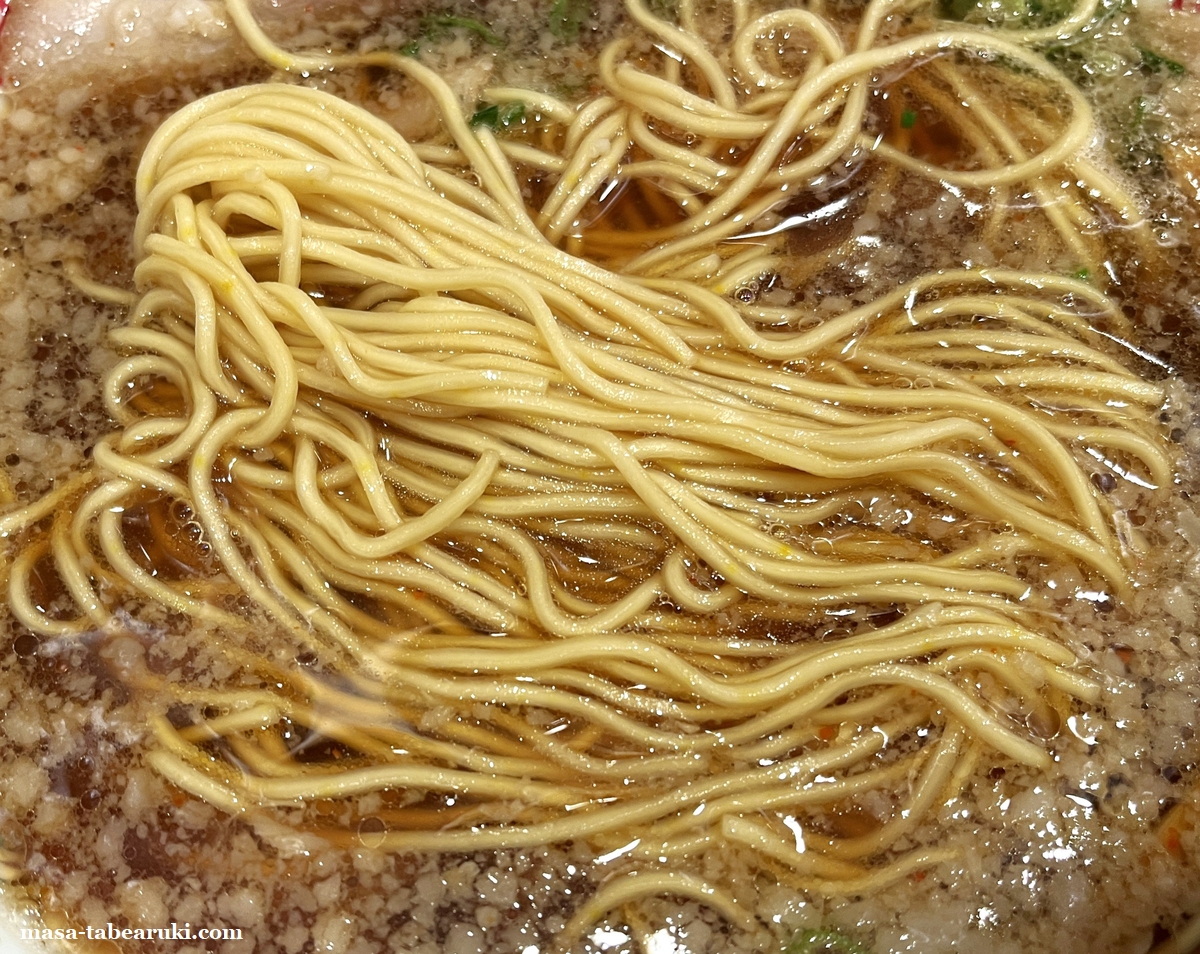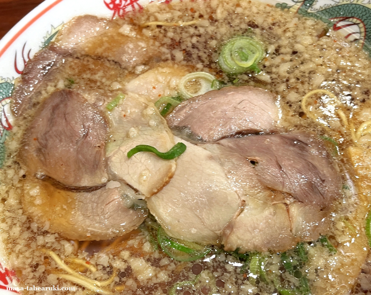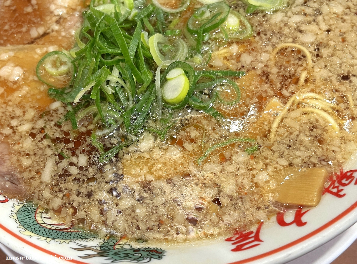 今回は一番オーソドックスな京都背脂醤油ラーメンにしました。具材はチャーシュー、ネギ、メンマとなっており、背脂もタップリと浮いてます。好みはすべて変更せずデフォのままです。