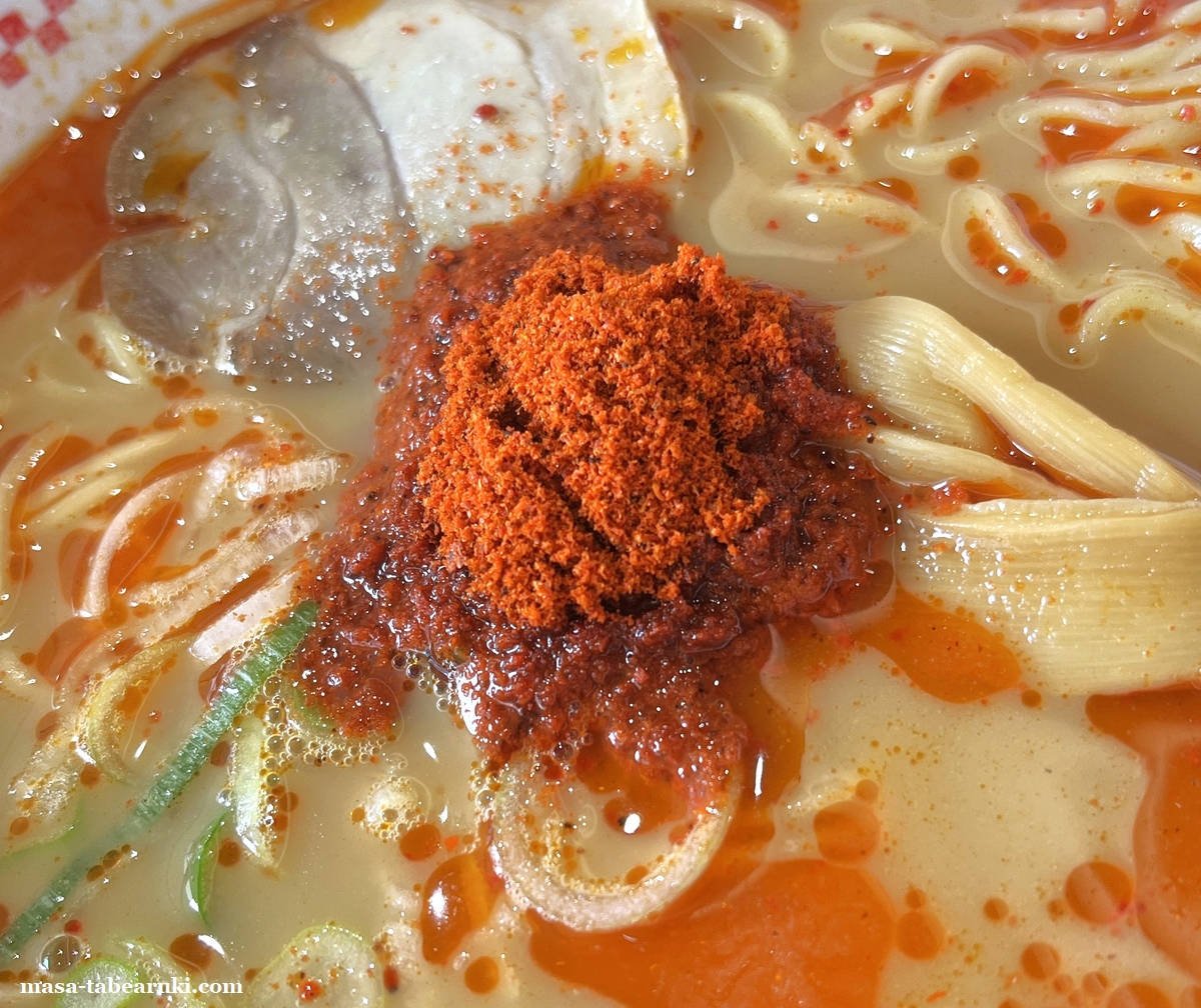 辛魚粉はスガ辛魚ラーメン専用にブレンドされ、辛さを抑えながらもコク深く重厚感のある味わいに仕上げたとPOPにも記載されています。確かに辛味は想像していたよりも優しめですが、辛いのは辛い(笑)しかし私には心地よい辛さで魚粉の風味もして、なかなか好印象の味変に思えます。