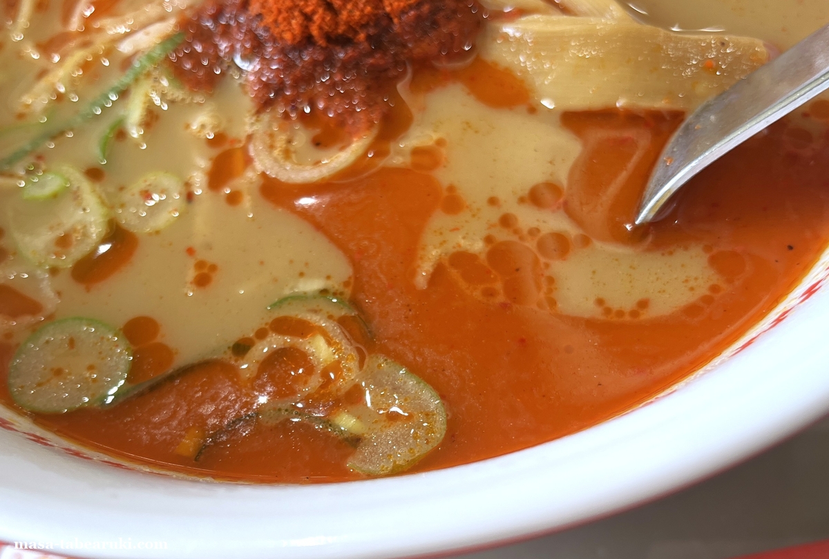 具材はチャーシュー、ネギ、メンマ、そして辛魚粉となっており、スープ表面にはラー油のようなオレンジ色も浮いてなかなか辛そうな見ためではあります。