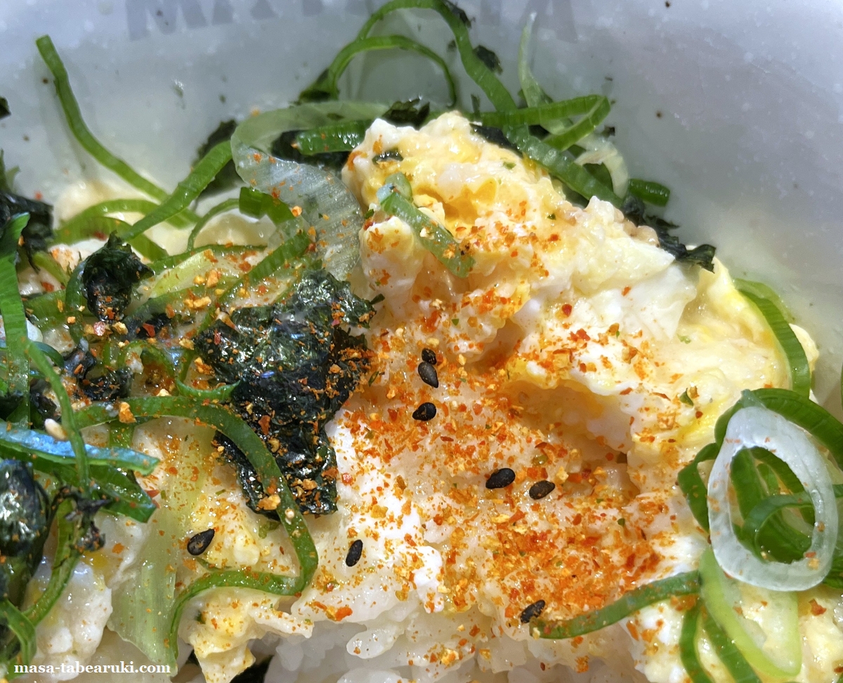 海苔は袋ごと握りつぶして細かくし、丼にふりかけて使用するのが自分流。あっさりとしたたまご丼に海苔の風味が付加され良い具合に変化。また他に変化させるなら卓上の七味をかけて食べるのも悪くありません。