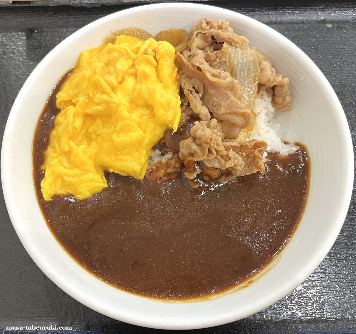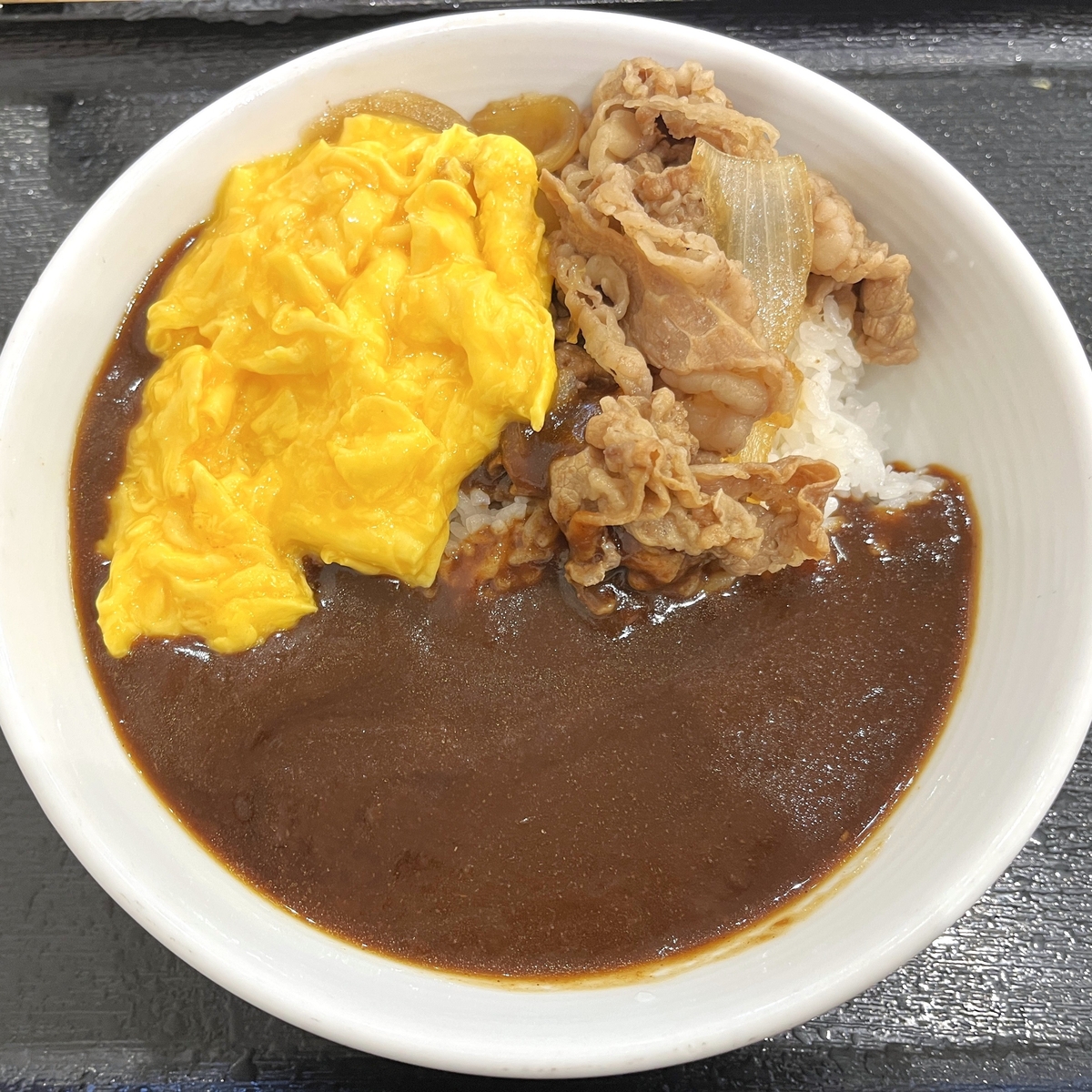最初からオム玉子を全投入して食べることに。カレーと牛丼の肉は風味もピッタリで相性もかなり良いと思いますが、オム玉子もトロトロ食感でカレーと良く合いますね。ハヤシライスにトッピングするよりも黒カレーの方が私にはより合うように思えました。