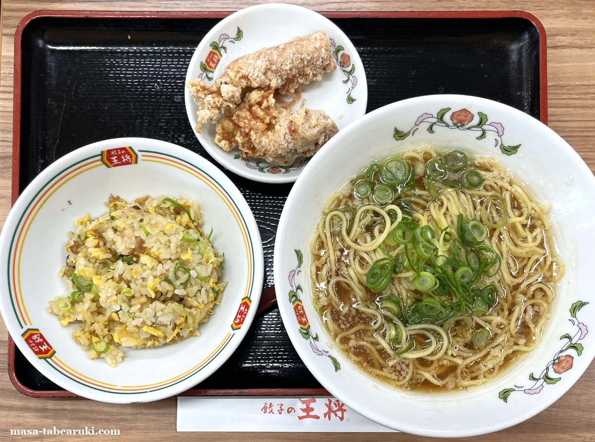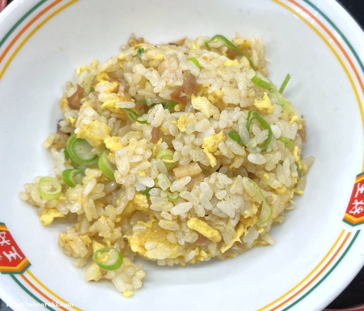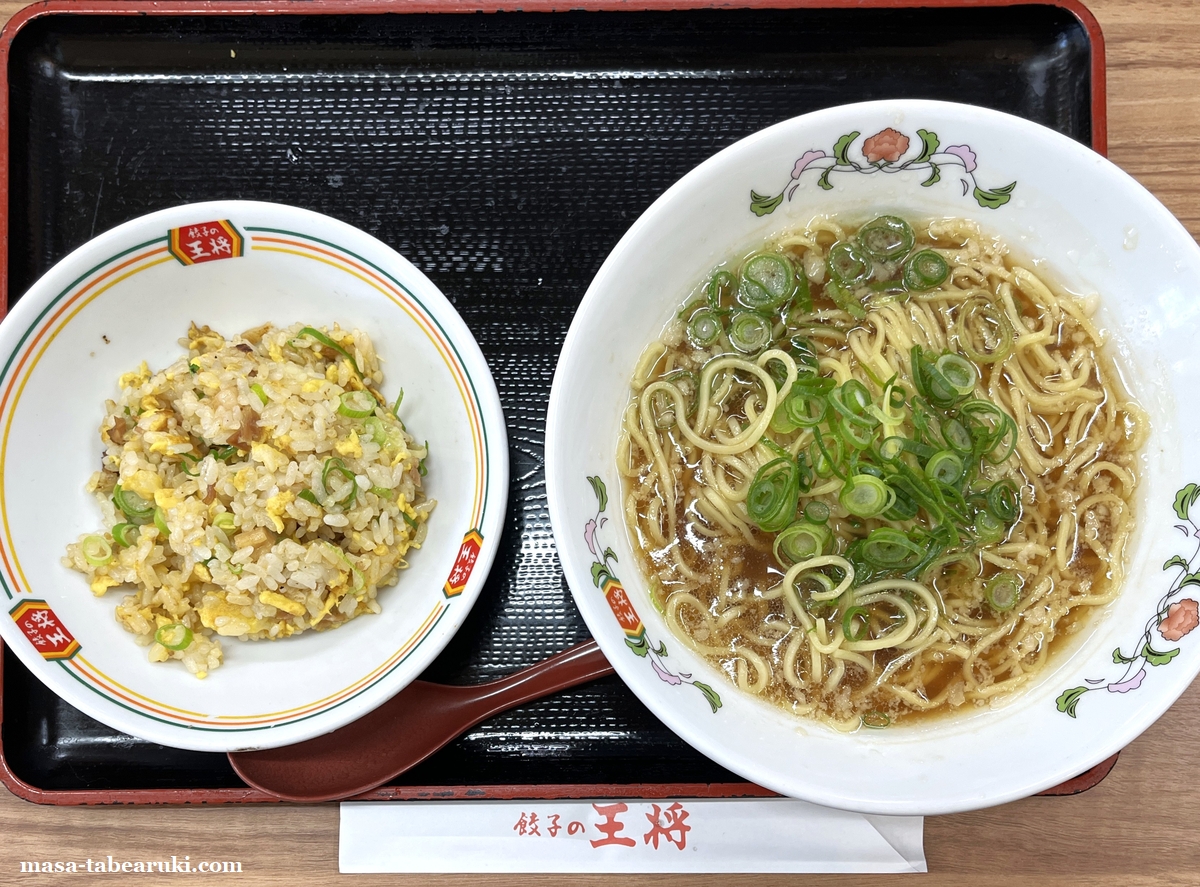 炒飯はいつものパラっとした王将の炒飯で、量的には一般的な半チャーハンくらいかな?わざわざ”ランチ炒飯”とあるので、ジャストサイズの炒飯とはまた量が違うのかもしれません。