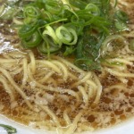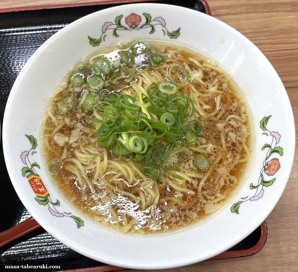 かけ醤油ラーメンは”かけ”のためトッピングは無く具材はネギのみ。メニューにトッピングが記載されていますが、これをしてしまうとせっかくの価格が高くなってしまうのでそのまま頂きます(お店的にはトッピングして貰いたいとは思いますが)。