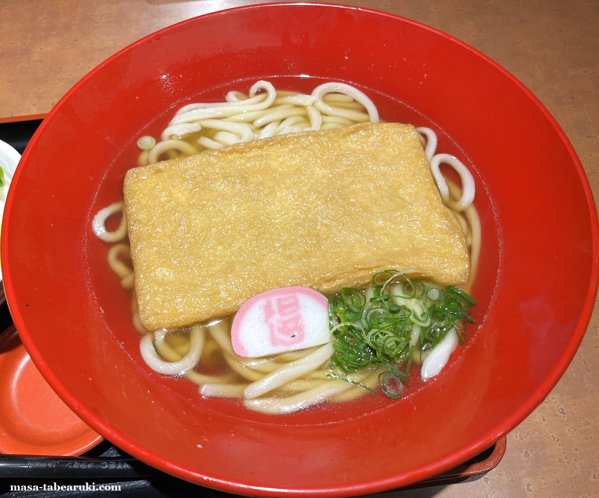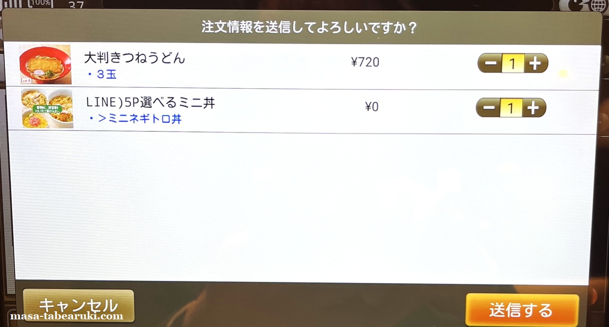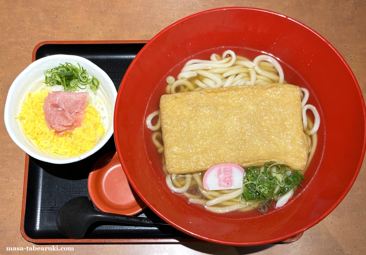 この特典を利用するにあたっては多少の制限があり、まずは税込み700円以上の注文が必要。そして他のクーポンとの併用は出来ないため、ちくわ天サービスのクーポンなども使用できません。この特典を利用する時は私にはお気に入りの組み合わせがあり、それが720円(店舗によって違うらしく740円のところも)の「大判きつねうどん」を3玉で注文して、ミニ丼は「ミニネギトロ丼」にすることです。