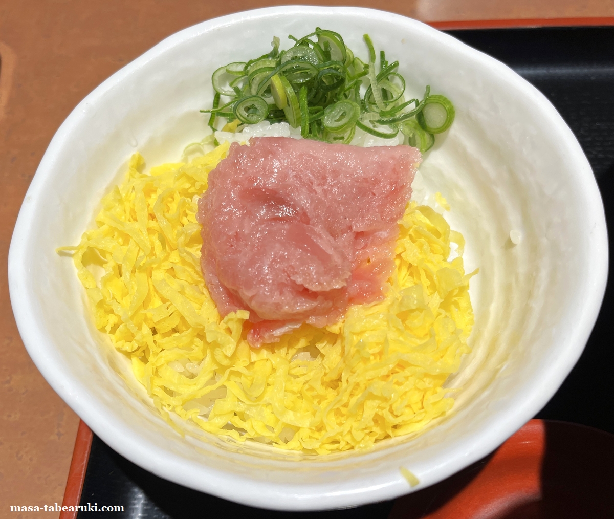 選べるミニ丼は他にミニかつ丼、ミニ親子丼からも選べ、特典では無く単品で注文する場合は税込420円で販売されている商品(同じものなのかは不明ですが名称は同じ)。一応すべての丼は試してみたものの、個人的に親子丼はあまり好みではなく、かつ丼も悪くはないのですがネギトロ丼の方の印象が良かったのでいつも注文してます。