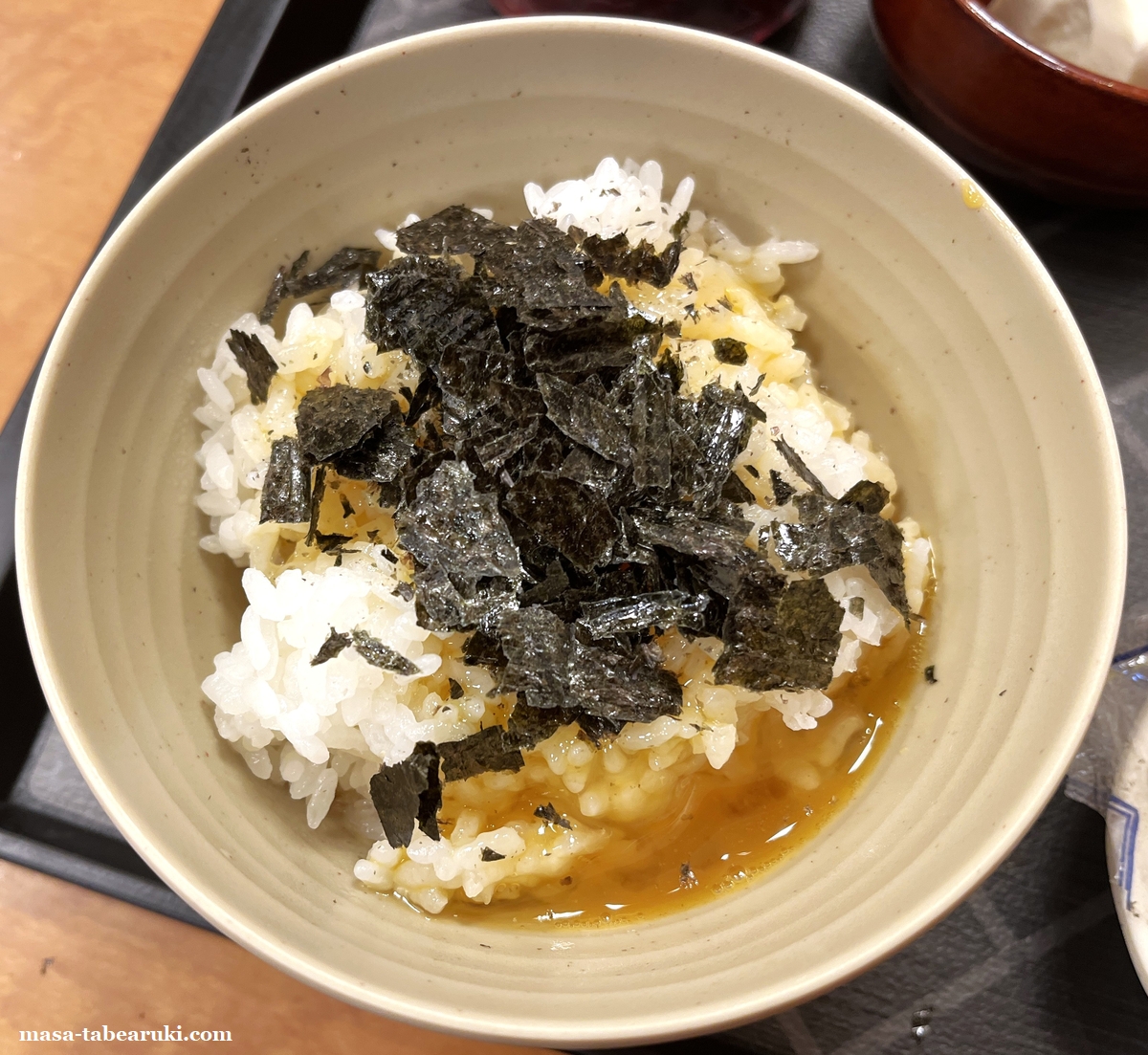 宮本むなしでは来店ごとに使用できる無料クーポンがあり、目玉焼き、生たまご、サラダ、ミニポテトフライのうちからひとつが無料サービスとなります。今回は軽く食べるつもりだったのでおかわりは封印して、貰った生たまごで玉子かけご飯にしました。海苔も砕いて玉子かけご飯にふりかけて食べたけど、おかわりする時はもちろん別々で食べます。