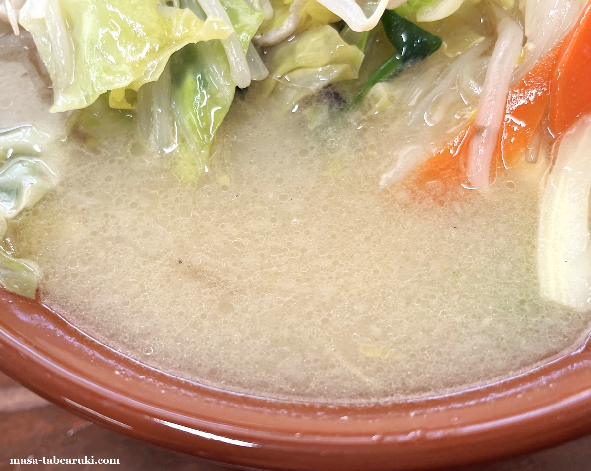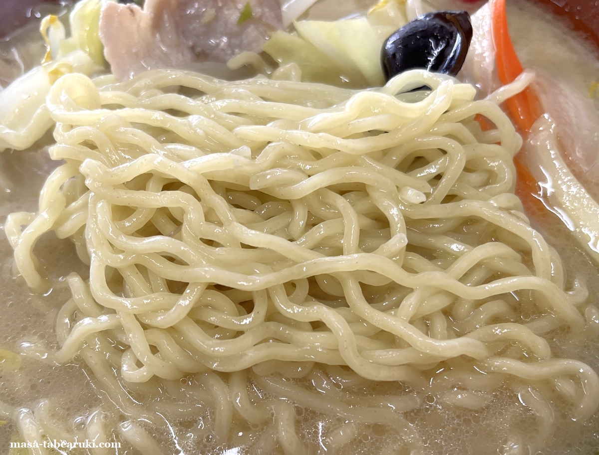麺は強めの縮れが入ったタイプで、プリっとした食感がありどのラーメンでも使用されているものかと思われます。スープは色からして優しい味わいかと思いきや、割りと塩気もあり炒めた野菜から来るものか、油感と野菜の旨味も含まれている印象。