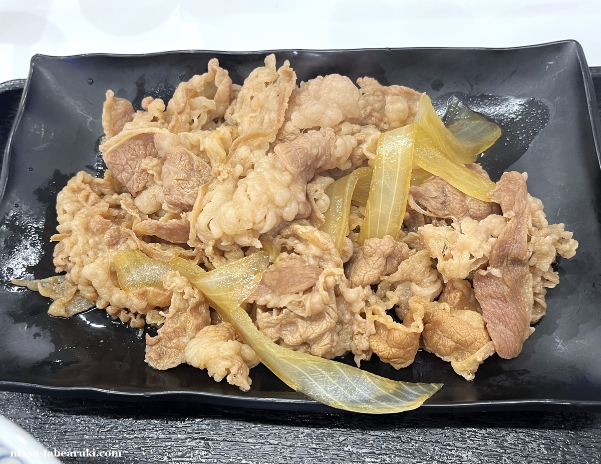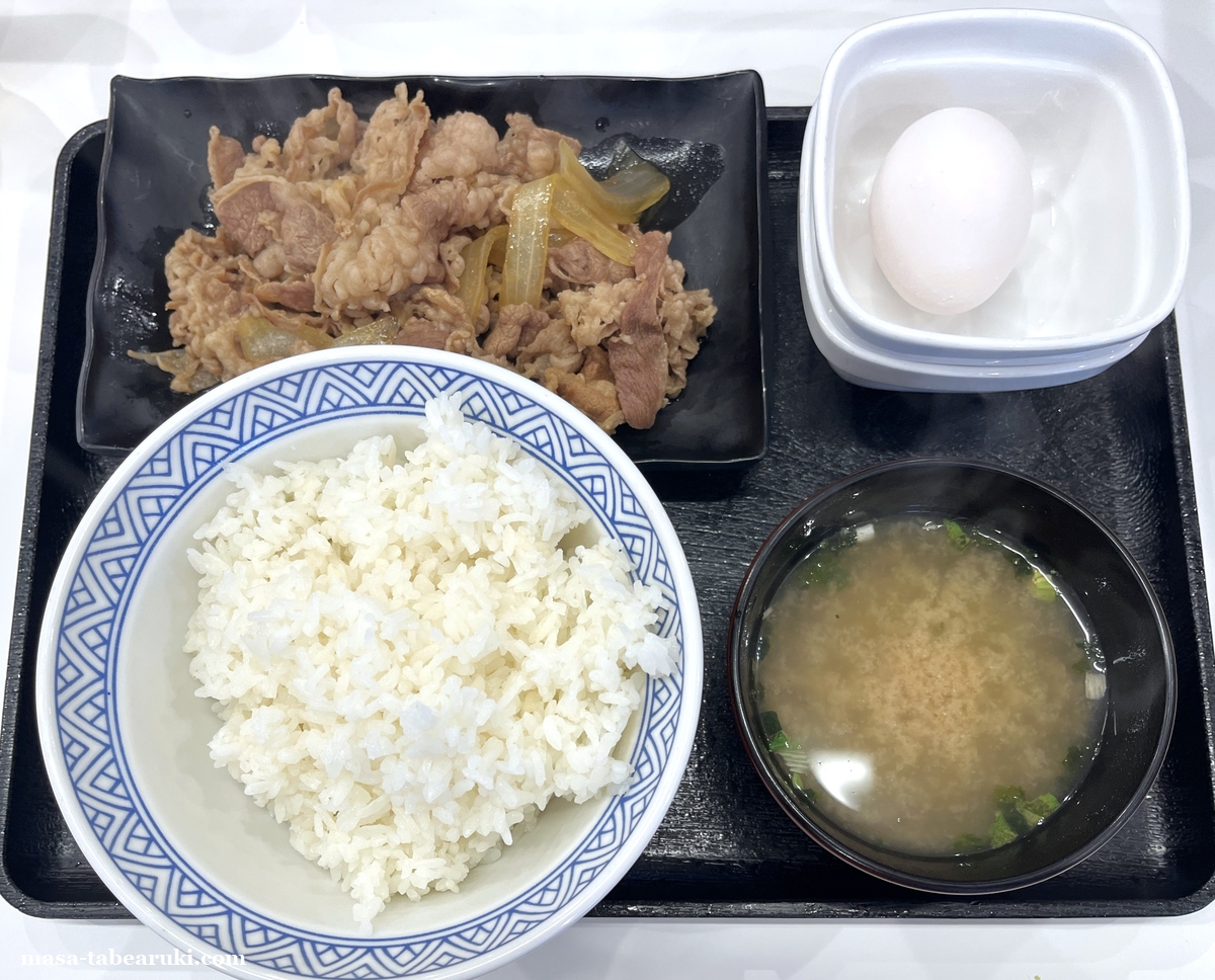 以前に特盛を食べた時と比べるとやや多く感じますが、あくまで目分量(笑)牛皿定食の特盛の価格は税込みで1,009円と千円をちょい超えてますが、並盛は789円と割と安めとなっています。牛丼の具材が皿に盛られたものと、ご飯、生たまご、みそ汁がセットになっている定食で、ご飯の増量およびおかわりは無料で可能。