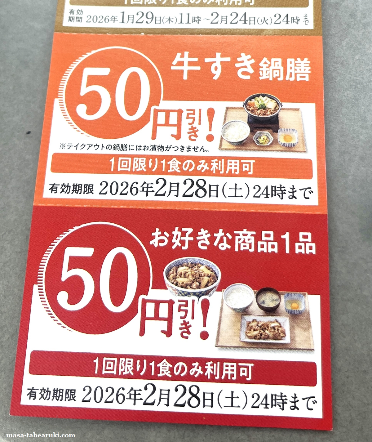 先日訪問した時に貰っていた紙のクーポンです。鍋膳の割引の他にお好きな商品の50円引きもあり、牛皿定食でもOKだったので使用しました。使えるもんは使わんとね。