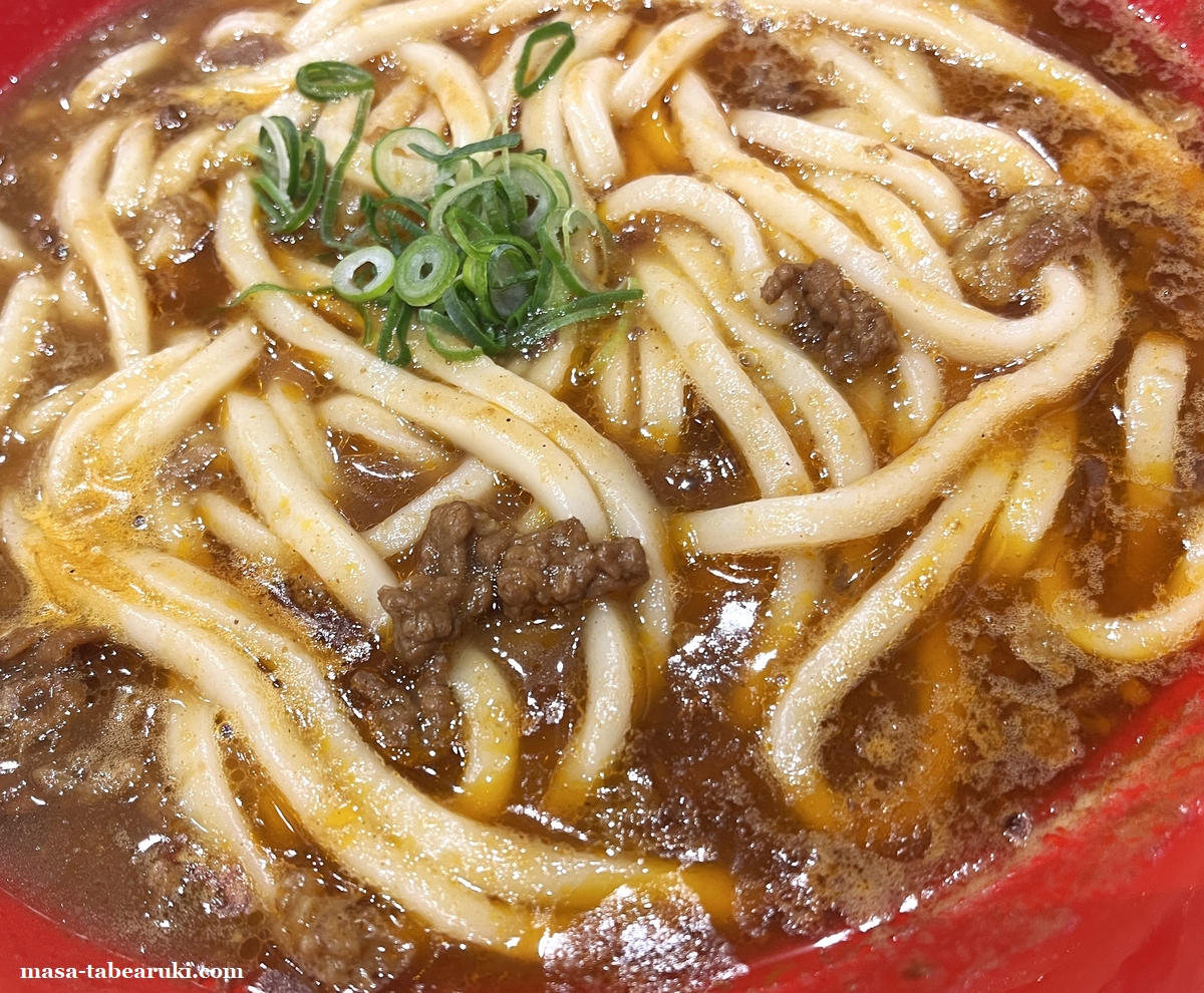 うどんは1玉から3玉まで同一料金のため、もちろん3玉にしております。カレー粉と数種類のスパイス、そしてマンゴーチャツネを使用したルーは酸味と甘みを感じる味わいで、だし割りとなっているためやや緩めの口当たり。うどんは大体柔らかめの食感なのでもうちょいカタメの方が個人的には好み。
