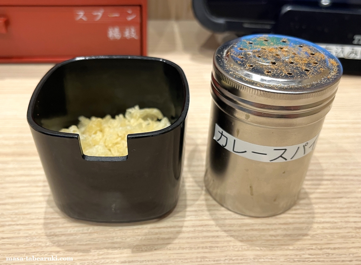 私的にはこのカレースパイスは必須。というのもデフォの状態では辛味が足りず、入れてちょうど良いくらいになるためでこれもセルフコーナーに置いてあります。