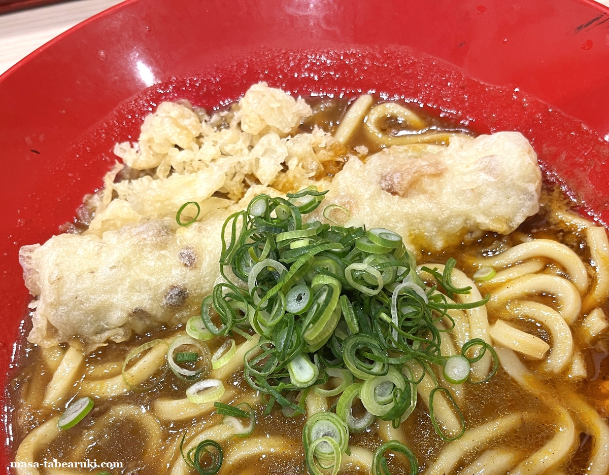 カレーうどんを注文するとセルフコーナーで必ず取るのが天かすとカレースパイス。ネギもあるので後から再度取りに行き、クーポンで貰ったちくわ天も載せると何も載っていなかったカレーうどんが無料でちょっと豪華に(笑)