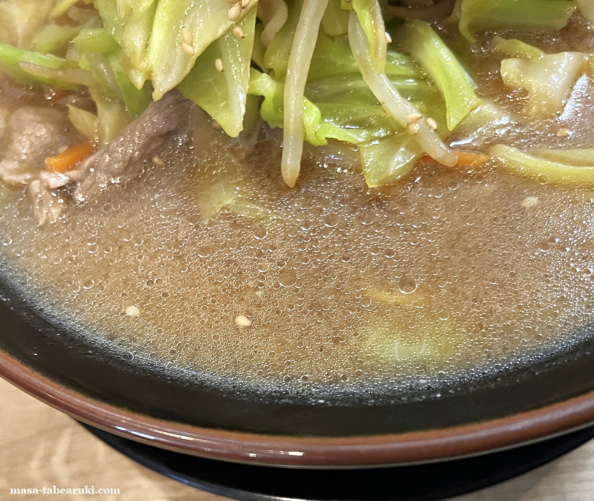 野菜はキャベツが中心でその他にはニンジン、モヤシ、キクラゲ、豚肉、胡麻となっており、一度茹でてあるのかキャベツが甘いのが印象的で、食感はやや柔らかめとなっています。ノーマルのまるいちちゃんぽんには野菜の量は370g一日分の野菜との記載があり、舞鶴味噌もこのくらいはありそうに思えます。